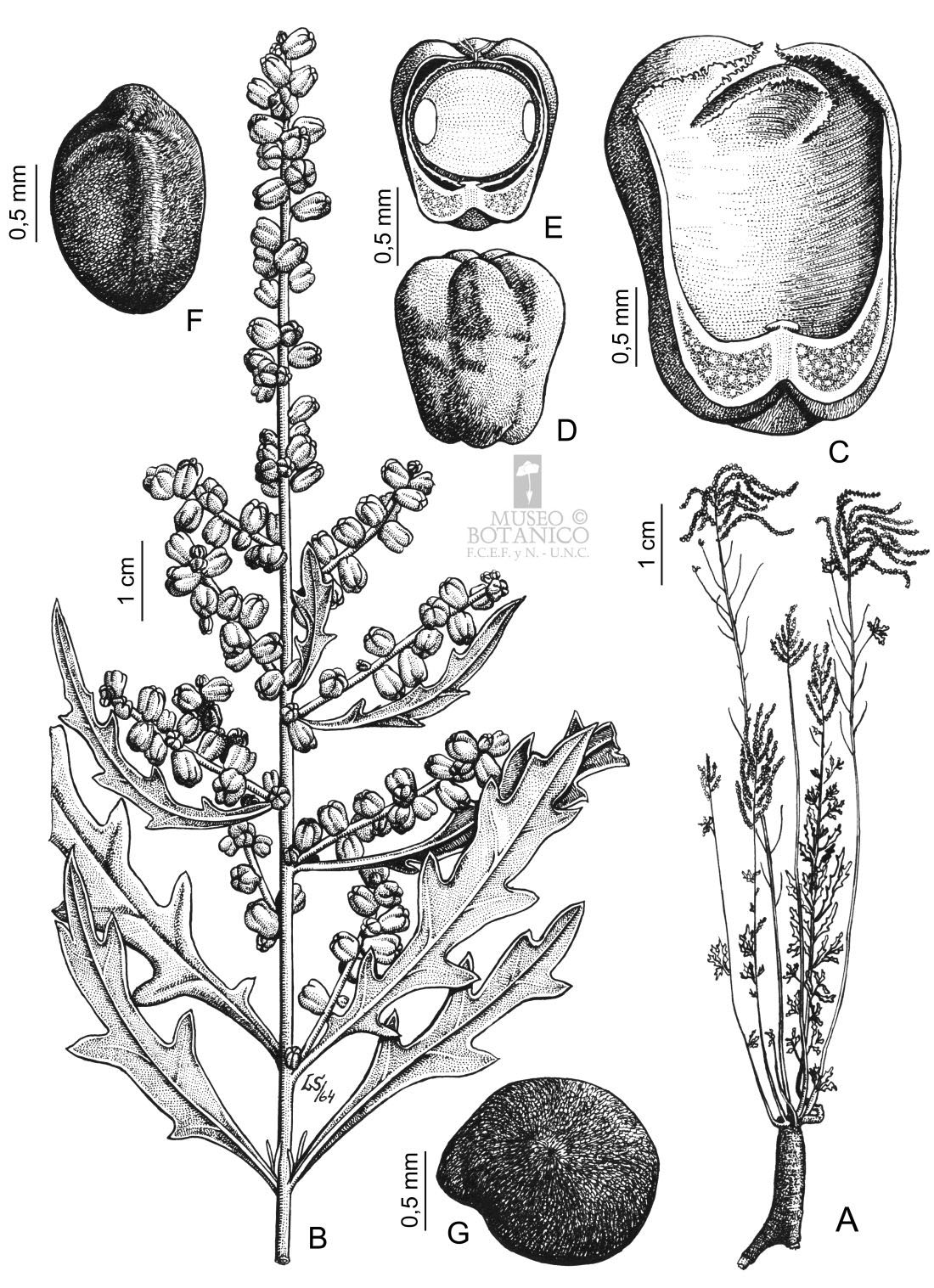 A. Planta. B. Rama florífera. C. Corte longitudinal del cáliz. D-E. Cáliz fructífero, vista lateral y corte longitudinal dejando ver al fruto, respectivamente. F-G. Semilla.