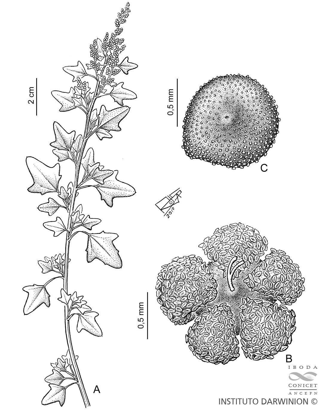 Hierbas anuales, hasta de 60 cm de alto, farinosas especialmente en la cara abaxial de las hojas. Tallo simple o ramificado, con ramas ascendentes. Hojas alternas, pecíolos casi tan largos como la lámina, ésta deltoidea, de 1,4-1,8 × 0,9-1,8 mm, 3-lobuladas; margen entero, a veces con 1-2 dientes de cada lado; base aguda; ápice agudo o redondeado. Inflorescencias en glomérulos reunidos en panojas terminales, pequeñas y laxas. Flores perfectas; cáliz con 5 sépalos unidos en la base; estambres 5; estigmas 2. Cáliz fructífero estrellado, de 1,5-2,2 mm de diámetro, cuyos sépalos son carenados y estrechos en la parte inferior, formando senos agudos o redondeados a través de los cuales se puede ver el fruto, cubiertos por tricomas vesiculiformes blancos. Frutos utrículos lenticulares a globosos, de 0,9-1 mm de diámetro; pericarpo pardusco, generalmente algo papiloso, adherido a la semilla. Semillas horizontales, lenticulares a globosas, castaño oscuras a negras; tegumento finamente granuloso; radícula prominente.