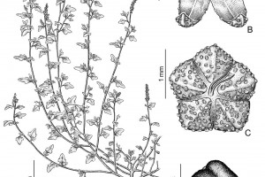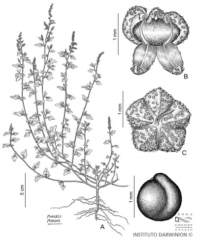 Hierbas anuales, hasta de 40 cm de alto, farinosas en las partes jóvenes y en el envés de las hojas, verde oscuras a negruzcas en seco. Tallo erecto, ramificado desde la base; ramas inferiores efusas, medias y superiores erectas. Hojas alternas, pecioladas, deltoideas, de (1-)1,5-2(-3,5) × 1-2(-2,5) cm, 3-lobadas; margen entero; base agudo-truncada; ápice redondeado. Inflorescencias en glomérulos paucifloros reunidos en panojas terminales. Flores perfectas; cáliz con 5 sépalos unidos desde la base hasta la parte media de su longitud; estambres 5, filamentos cintiformes, dilatados y unidos en la base; estigmas 2-3. Cáliz fructífero de contorno ± pentagonal, de 1,6-1,7 mm de largo, con sépalos carenados, dejando entre ellos senos angostos, cubriendo parcialmente al fruto. Frutos utrículos lenticulares, de 1,3-1,4 mm de diámetro; pericarpo membranáceo, frágil, castaño, no adherido a la semilla. Semillas horizontales, lenticulares, negras; tegumento granuloso; radícula muy prominente.