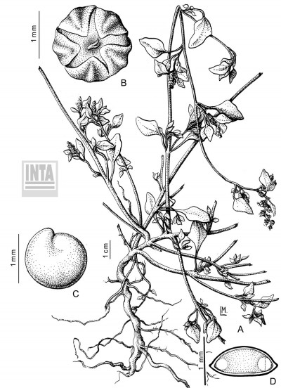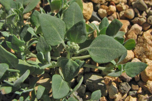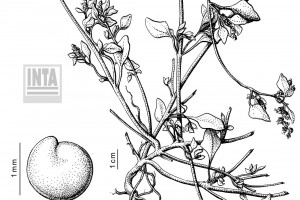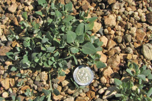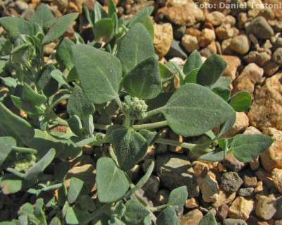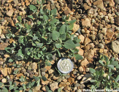 Hierbas anuales, algo hediondas, farinosas en todas sus partes. Tallo corto, con numerosas ramificaciones desde la base; ramas postradas a ascendentes, de 15-40 cm de largo, con algunos entrenudos muy largos y otros cortos, dispuestos irregularmente. Hojas alternas, pecioladas, rómbicas-ovadas, de 8-16 × 6-15 mm; margen entero; base redondeada a cuneada; ápice agudo. Inflorescencias en glomérulos agrupados en pequeñas panojas terminales y axilares. Flores perfectas; cáliz con 5 sépalos deltoideos, unidos desde la base hasta la parte media de su longitud; estambres 5; estigmas 2. Cáliz fructífero modioliforme, de 1,7-1,8 mm de diámetro, sépalos completamente cubiertos por tricomas vesiculiformes blancos y abrazando casi completamente al fruto. Frutos utrículos lenticulares a globosos, de 1,3-1,4 mm de diámetro; pericarpo blanco amarillento, granuloso, adherido a la semilla. Semillas horizontales, globosas, negras; tegumento liso.