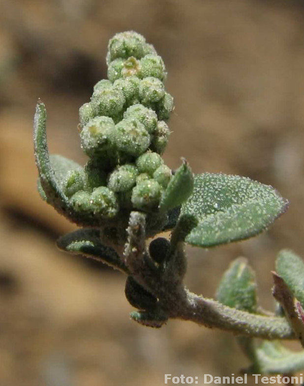 Hierbas anuales, algo hediondas, farinosas en todas sus partes. Tallo corto, con numerosas ramificaciones desde la base; ramas postradas a ascendentes, de 15-40 cm de largo, con algunos entrenudos muy largos y otros cortos, dispuestos irregularmente. Hojas alternas, pecioladas, rómbicas-ovadas, de 8-16 × 6-15 mm; margen entero; base redondeada a cuneada; ápice agudo. Inflorescencias en glomérulos agrupados en pequeñas panojas terminales y axilares. Flores perfectas; cáliz con 5 sépalos deltoideos, unidos desde la base hasta la parte media de su longitud; estambres 5; estigmas 2. Cáliz fructífero modioliforme, de 1,7-1,8 mm de diámetro, sépalos completamente cubiertos por tricomas vesiculiformes blancos y abrazando casi completamente al fruto. Frutos utrículos lenticulares a globosos, de 1,3-1,4 mm de diámetro; pericarpo blanco amarillento, granuloso, adherido a la semilla. Semillas horizontales, globosas, negras; tegumento liso.