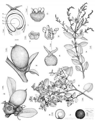 Arbustos o subarbustos trepadores, de 2-3 m de alto, farinosos en las partes tiernas. Hojas opuestas o alternas, lanceoladas, elípticas o subhastadas, de borde entero y ápice obtuso, de 1-3,5 × 0,7-2,2 cm. Inflorescencias hasta de 4,5-5 cm de largo. Flores diclinas o polígamas; las estaminadas reunidas en espigas; cáliz urceolado de 5 sépalos libres hasta la mitad; estambres 5; las pistiladas axilares, con cáliz igual al de las estaminadas, persistente. Ovario subgloboso, comprimido, con 2 estigmas subulados. Fruto: baya elipsoidal, roja o negra, de 3-6 × 3-4 mm; pericarpio no adherido a la semilla. Semilla vertical, lenticular, de 3 mm de diámetro; embrión anular, rodeando al perisperma amiláceo; tegumento negro, liso, brillante.