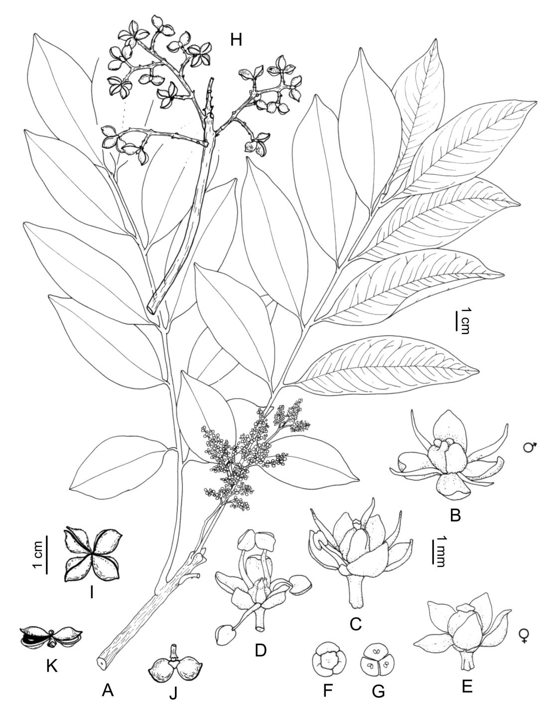 A. Rama florífera. B-D. Flores. E. Flor. F. Ovario visto desde arriba. G. Ovario, corte transversal. H. Infrutescencia. I. Fruto. J-K. Detalle del fruto. Tomado de Fl. Paraguay 8: fig. 12. 1987.