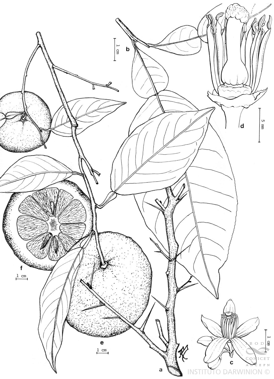 A. Rama con espinas. B. Hoja. C. Flor. D. Detalle de androceo y gineceo (estambres parcialmente quitados). E. Rama con frutos. F. Corte transversal de un fruto.