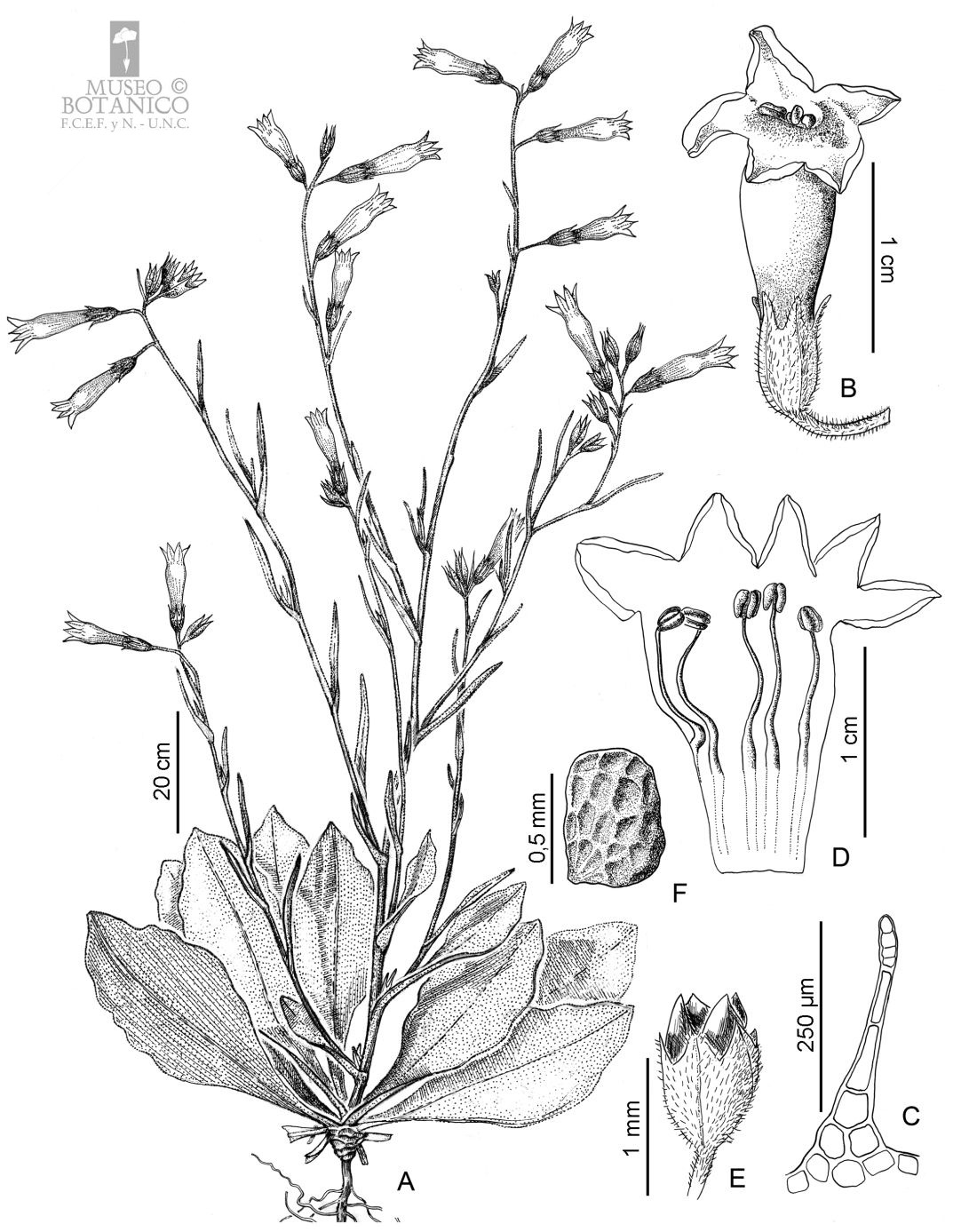 Hierbas arrosetadas, pubescentes. Hojas sésiles; láminas ovadas y apenas decurrentes. Flores péndulas; cáliz con lacinias equilongas breves, menores que la mitad del tubo; corola blanca, limbo zigomorfo, oblicuo, de lacinias ovado-agudas, tubo dorsalmente ventricoso cerca de la boca, dilatado en el medio y basalmente constreñido, ca. 12 mm; estambres incluidos, adheridos al mismo nivel por arriba de la mitad del tubo y de dos longitudes, apicalmente curvos, pares geniculados en la base; estilo incluso.