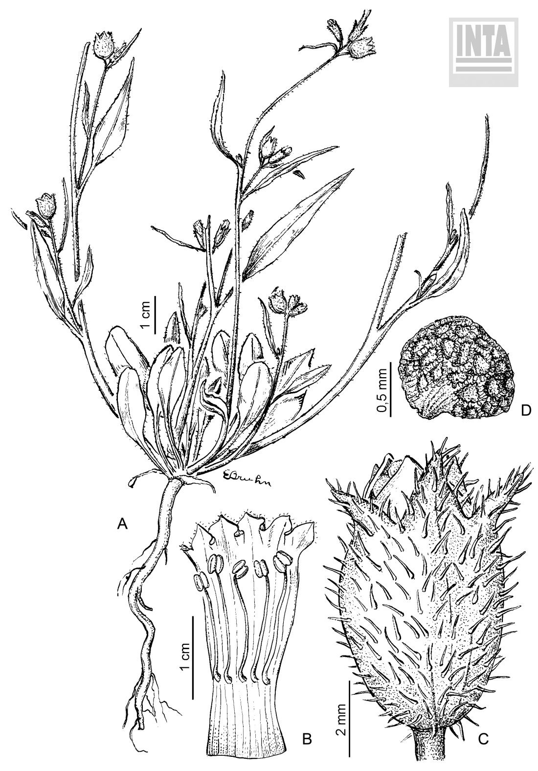 Hierbas erectas pubescentes, laxamente ramificadas o compactas. Hojas pecioladas; láminas angostamente elípticas, margen recto u ondulado. Brotes floríferos erguidos con inflorescencias parciales contraídas, provistas de brácteas lineares. Flores erguidas; cáliz con lacinias equilongas de menor longitud que el tubo y provistas de membranas comisurales notables; corola blanca, limbo actinomorfo horizontal de lóbulos hemielípticos agudos, tubo apenas ventricoso en el dorso cerca de la boca, ca. 11 mm; estambres incluidos, adheridos a la misma altura debajo de la mitad del tubo, de dos longitudes; estilo incluso. Cápsula de 6-10 mm.