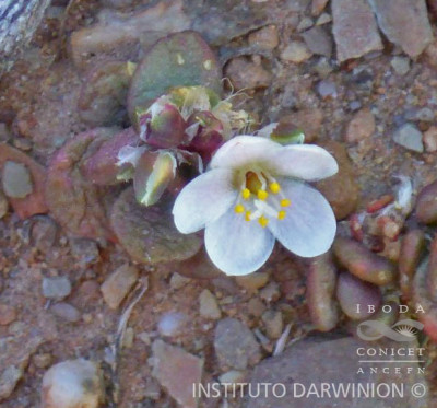 Hierba perenne, enana, crasa; raíz tuberosa-napiforme o con varias ramificaciones tuberoso-moniliformes; tallos de 1-4 cm de alto, lisos, de entrenudos breves a muy breves. Hojas alternas a subopuestas, sésiles, crasas, ovadas, elípticas u obovadas, de 4-6 × 3 mm, enteras, con un apículo diminuto de 0,5-0,8 mm de largo, hialino, efímero; estípulas en forma de pelos axilares blanquecinos, hasta de 2-3 mm de largo. Inflorescencia cimosa, en cincino paucifloro terminal, de 2-4(-6) flores; brácteas ovadas, de 3-3,5 mm de largo, apiculadas, de borde eroso, 1-nervadas, membranáceas, hialinas, 1(-2) ubicadas en el nudo basal de la inflorescencia y de a pares en los nudos siguientes, persistentes, con pelos axilares, a veces con brácteas basales carnosas, foliáceas. Flores subsésiles, con pedicelos de 0,5 mm de largo; sépalos ovados, de 3,5-5 mm de largo, efímeramente apiculados y con el margen membranoso-hialino, entero o algo eroso, de dorso romo, carnosos, caducos, verdosos; pétalos obovados a elípticos, de 4,5-4,7 × 3-4 mm, apiculados a emarginados, imbricados, blancos y con un ligero tinte rosado después de la antesis, caducos; estambres 6-8, los filamentos glabros; estilo de ápice 3-fido. Fruto cápsula de 3-4,3 mm de largo, con semivalvas externas del epicarpo caducas y semivalvas internas nervosas, reticuladas, translúcidas, persistentes, alternando con filamentos intercalares ligeramente más cortos. Semillas subturbinadas, de 0,6-0,8 mm de largo, con papilas microscópicas; embrión curvo, en forma de gancho, no rodeando completamente al perisperma.