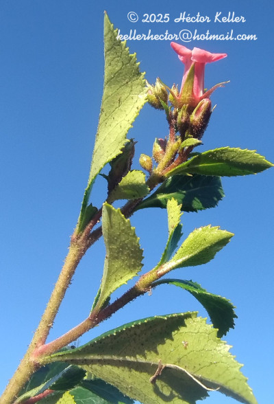 Arbustos hasta de 2-4(-5) m de alto, tallos glabros o pubescentes, los más jóvenes pilosos a hirsutos, pelos cortos, cinéreos, corteza que se renueva rápidamente, comúnmente con glándulas rojas estipitadas. Hojas solitarias o fasciculadas (3), muy variables en forma y tamaño, ovadas, elípticas, obovadas a obovado-oblongas, a veces, lanceoladas a oblanceoladas, de 2-5(-8) × (1-)1,5-2,5(-4,5) cm, frecuentemente cortamente acuminadas, glabras, excepto por el nervio medio en ambas superficies; siempre con glándulas en la superficie abaxial, cartáceas, margen distal con dientes agudamente serrados o bi-serrados; subsésiles. Flores en panículas abiertas, con hojas hasta la base, terminales o laterales, con (3-)7-10(-30) flores, a veces sólo 2; pedicelos delicados, de (3-)5-8(-15) mm, densamente piloso-patentes, más raramente subglabros, con glándulas estipitadas; hipanto turbinado, glabro o pubescente, cubierto con abundantes glándulas estipitadas y subestipitadas, de 1,5-3 × 2-2,5 mm; tubo del cáliz ca. 2 mm de largo, glabro o pubescente, lóbulos del cáliz triangular-subulados, margen glanduloso, de 1,5-2,5 mm de largo; pétalos linear-espatulados, de (8-)10-12(-14) mm de largo, rojos, la base ca. 2 mm de ancho; estambres ca. 9 mm de largo; disco intraestaminal marcadamente cónico, ápice 5-lobulado, ca. 2,5 mm de largo; estilo ca. 9 mm de largo, ápice connado, libre hacia la base; estigma capitado. Cápsulas obovoides, de 7-8 × 3,5 mm, castañas, opacas.