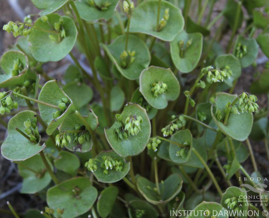 Hierba anual de 10-20 cm de alto, erecta y de tallos delgados. Hojas basales de 1-5 x 0,5-4 cm, obovadas, oblanceoladas, deltoides, rómbicas o reniformes, de ápice obtuso, apiculado o mucronado, base atenuadas en la base, las dos caulinares totalmente fusionadas en la base formando un disco perfoliado suborbicular o circular, de 1-6 cm de diámetro. Inflorescencia hasta de 25 flores; bráctea basal de 1,7-6,5 x 1,5-3 mm, ovada, lanceolada u oblongo-lanceolada; pedicelo de 0,3-1 cm de largo; sépalos de ca. 1,5-3 de diámetro, y algo desiguales entre sí, ovados o suborbiculares; pétalos de 2-5 x 1,2-2,5, unguiculados, blancos o rosados; filamentos de 1-2,5 mm de largo, anteras de ca. 0.4 mm de largo; ovario de ca. 1 mm de largo, estilo de 0,7-1,5 mm de largo, ramas estigmáticas de ca. 1 mm de largo. Fruto una cápsula de 2-3 x 1,5-2 mm. Semillas 3, de 1,2-1,5 mm de diámetro.