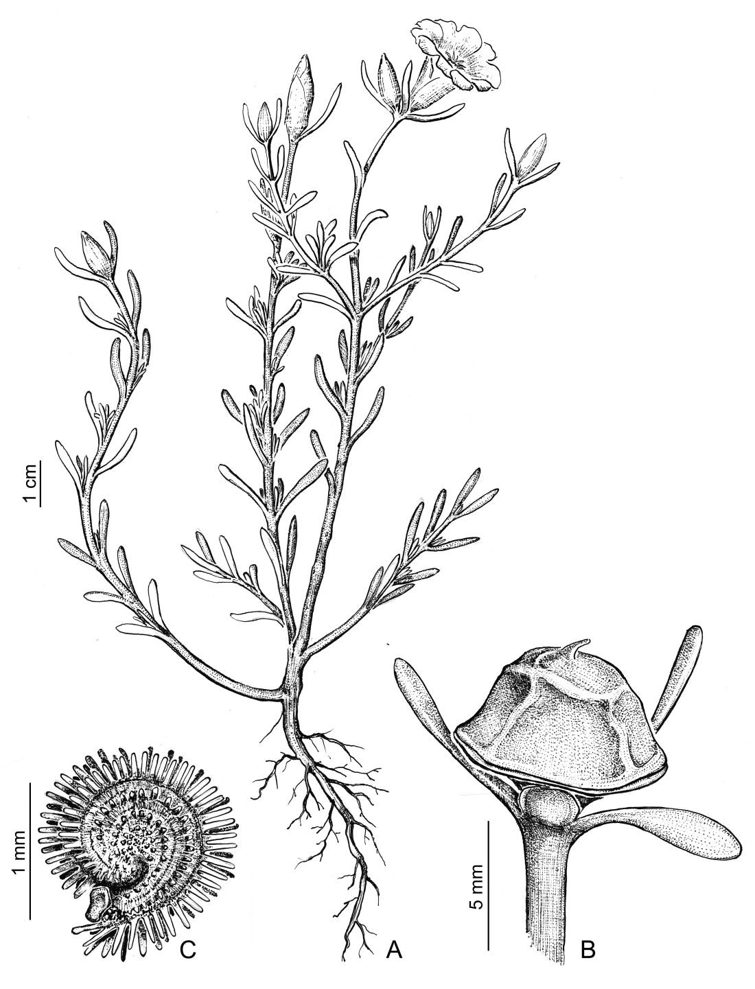 Panta anual, glabras, con los tallos algo carnosos, rojizos. Hojas linear-lanceolada a espatulada, de 1,5-3,5 x 0,2-0,5 cm, obtusas, de ápice truncado. Flores solitarias, de ca. 4 cm de diámetro, con los sépalos ovados, de 8-12 x 8-9 mm; pétalos obcordados, de 20-30 mm de largo, purpúreos con una mácula basal negra; flores rodeadas por 2-5 hojas apicales y bracteolas lineares, de 8-10 mm de largo; estambres 8-10 o mas; estilo de ca. 10 mm de largo, con 5 ramas estigmáticas de 2 mm de largo. Fruto una cápsula, de 7-10 mm de largo, ocupada en su mayor parte por el opérculo acampanado hasta cónico, de ca. 6 mm de largo. Semillas de 1,7-2 mm de diámetro, achatadas, con 4 hilares dorsales de grandes espinas anseriformes, de 0,3-0,4 mm de largo, pardo-rojizas.