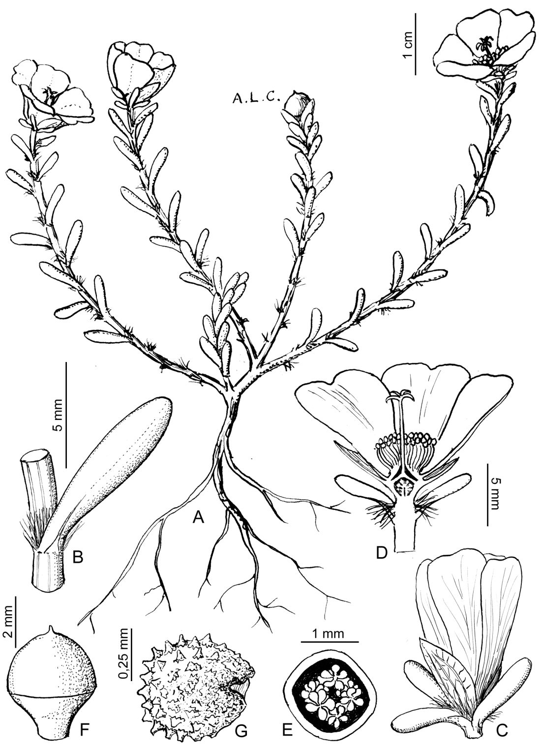 Plantas perennes, con los tallos decumbentes, siempre erectos durante la floración, hasta de 30 cm de alto. Hojas oblongo-cuneiformes hasta oblongo-espatuladas, de 5-12(-15) x 2-3(-4), de ápice subobtuso; pelos estipulares en cortos mechones algo rígidos, hasta de 4 mm de largo. Flores solitarias o 2-3, purpúreas, rodeadas por verticilos de 6-7 hojas, a veces ausentes; sépalos desiguales, el mayor mas o menos ovado-orbicular con un ancho margen hialino, el menos más o menos trinagular, ambos apiculados-orbiculares en el ápice, de ca. 8 mm de largo; pétalos redondeado-obovados, de 14-25 mm de largo, escotados en el ápice; estambres numerosos dispuestos en dos series sobre el anillo basal; estilo de 8-10 mm de largo, con 6-7(-8) ramas estigmáticas, lineares, de color purpúreo. Fruto una cápsula con opérculo hemisférico de 2,5-3 mm de largo, de dehiscencia más abajo de la mitad y a veces, llegando al tercio superior. Semillas de 0,5-0,65 mm de largo, rostradas, con tubérculos cilíndricos-cónicos, parduscas-amarillentas.