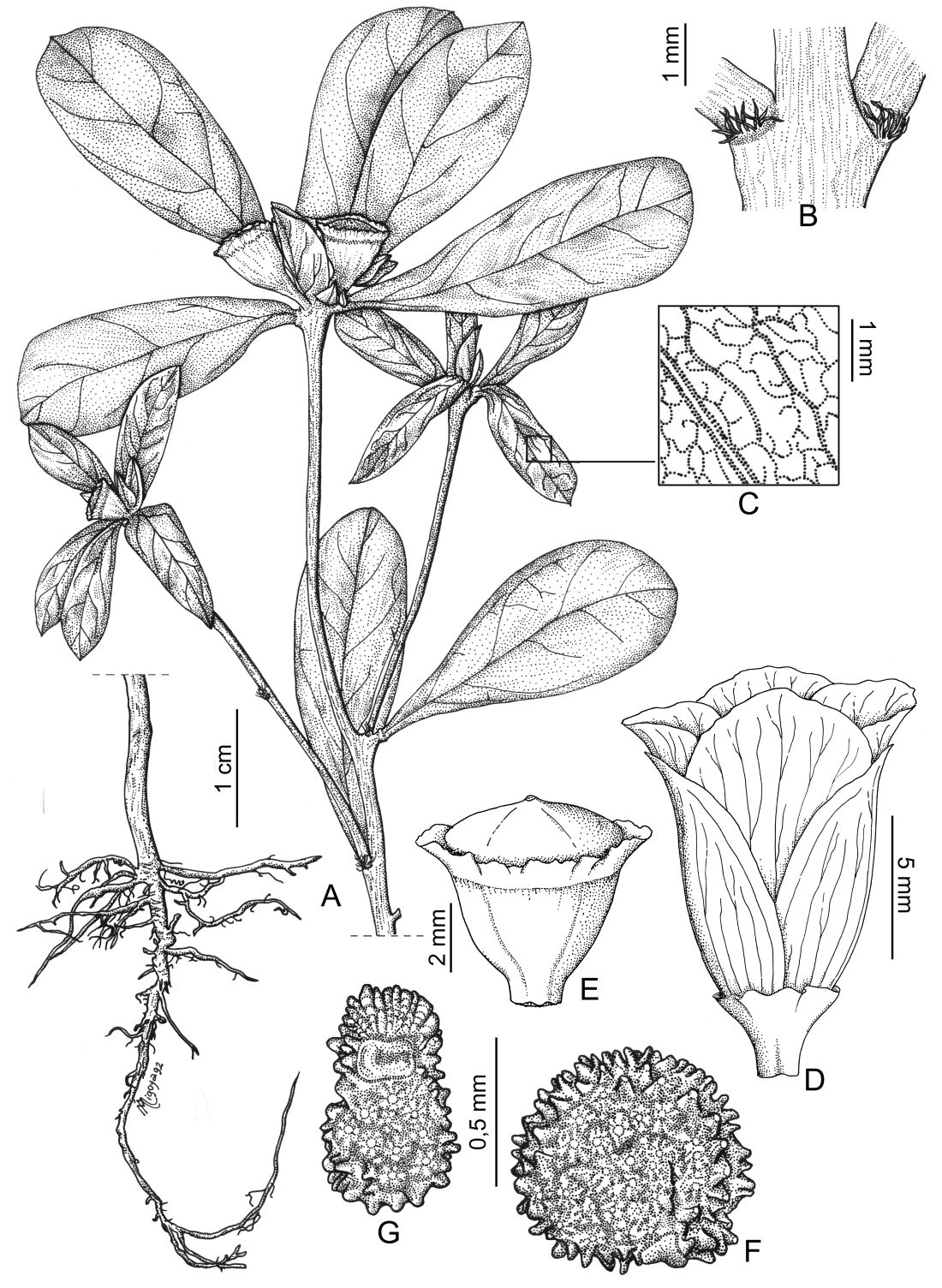 A. Planta en fruto. B. Nudo con tricomas axilares. C. Detalle de la lámina foliar. D. Flor, vista lateral. E. Cápsula con corona. F-G. Semilla, vistas lateral e hilar, respectivamente.