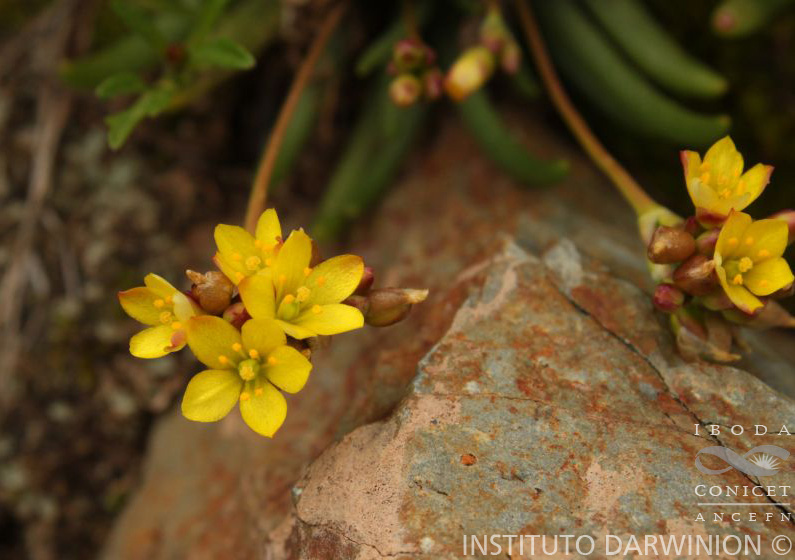 Hierba perenne de ca. 7 cm de alto, glabra, con una gruesa raíz suculenta hasta de 10(-20) mm de diámetro. Hojas en roseta basal, de 1,5-3,5 × 0,15-0,3 cm, con la nervadura central verde-pálida y de margen blanquecina. Inflorescencia en cimas terminales con las flores en pedicelos de 2-5 mm de largo; pedúnculo axilar de 2-3 cm de largo, rosado; brácteas de 3 × 0 5 mm de largo; bractéolas de 1,25 × 1 mm; sépalos de 2 × 1,5 mm,; pétalos amarillos; estambres 5. Fruto una cápsula de 3-3,5 × 2 mm, marrón pálido. Semillas de 0,5 mm de diámetro.