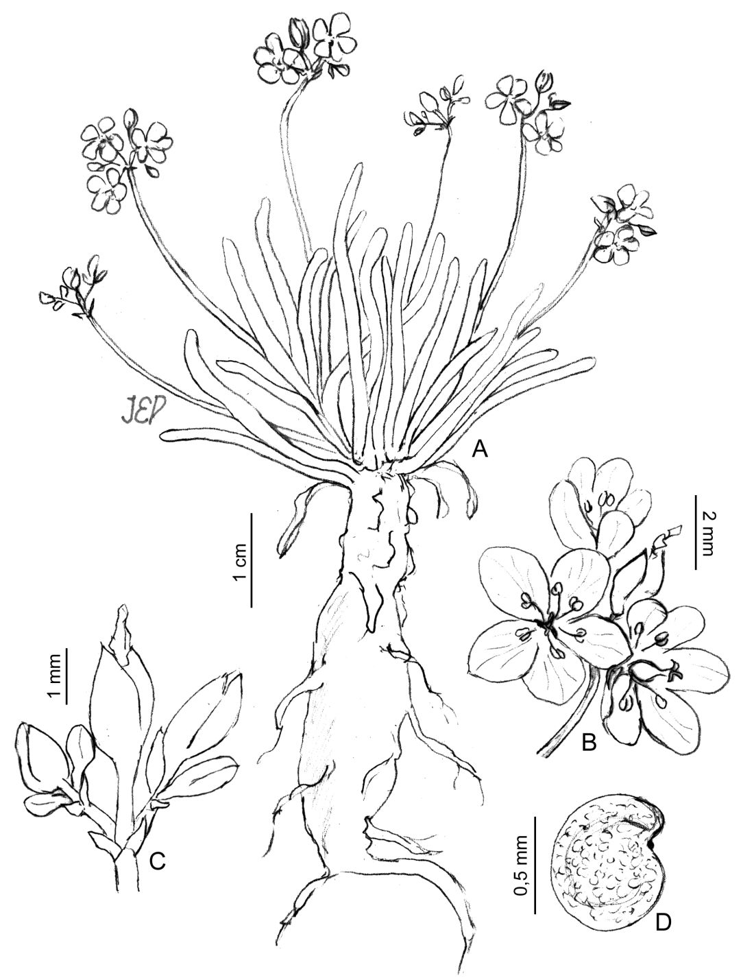 A. Planta. B-C. Inflorescencia. D. Semilla