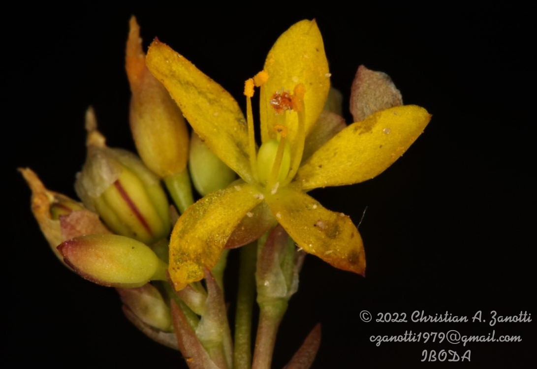 Hierba perenne de ca. 7 cm de alto, glabra, con una gruesa raíz suculenta hasta de 10(-20) mm de diámetro. Hojas en roseta basal, de 1,5-3,5 × 0,15-0,3 cm, con la nervadura central verde-pálida y de margen blanquecina. Inflorescencia en cimas terminales con las flores en pedicelos de 2-5 mm de largo; pedúnculo axilar de 2-3 cm de largo, rosado; brácteas de 3 × 0 5 mm de largo; bractéolas de 1,25 × 1 mm; sépalos de 2 × 1,5 mm,; pétalos amarillos; estambres 5. Fruto una cápsula de 3-3,5 × 2 mm, marrón pálido. Semillas de 0,5 mm de diámetro.