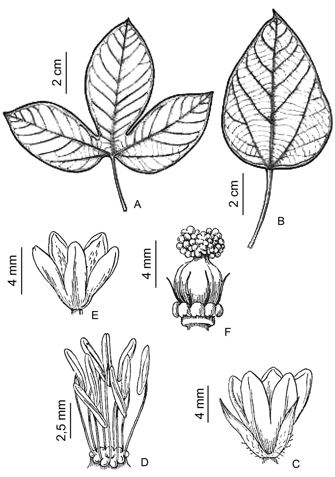 A-B. Hojas. C. Flor estaminada. D. Androceo. E. Flor pistilada. F. Gineceo. Tomado de Hoehnea 41: fig. 1, C-F. 2014 y Lilloa 9: fig. 20. 1942.