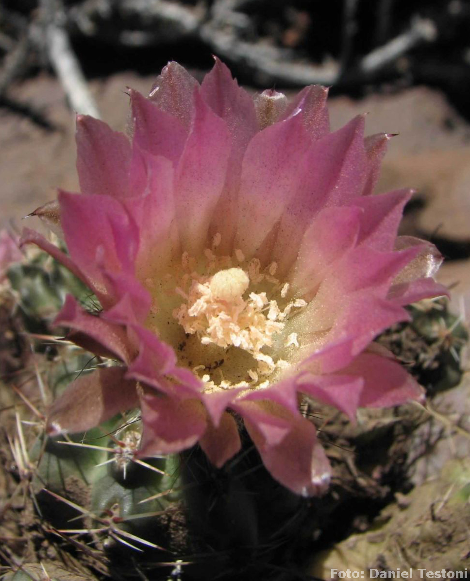 Plantas de (10) 15-40 cm alt. x (1,2) 8-15 cm diám., cilindricas, erectas. Costillas (8) 10-12, prominentes, obtusas. Espinas radiales 8-10 (11), delgadas, de ca. 1 cm; centrales (1) 3-4, más gruesas, de 2-3 cm, uncinadas o arqueadas. Flores de 6 cm x 10 cm diám., subapicales, con el receptáculo corto, muy escamoso. Piezas del perigonio rosadas a amarillentas. Estilo grueso, rojo; estigma ca. 16-lobulado, purpúreo.