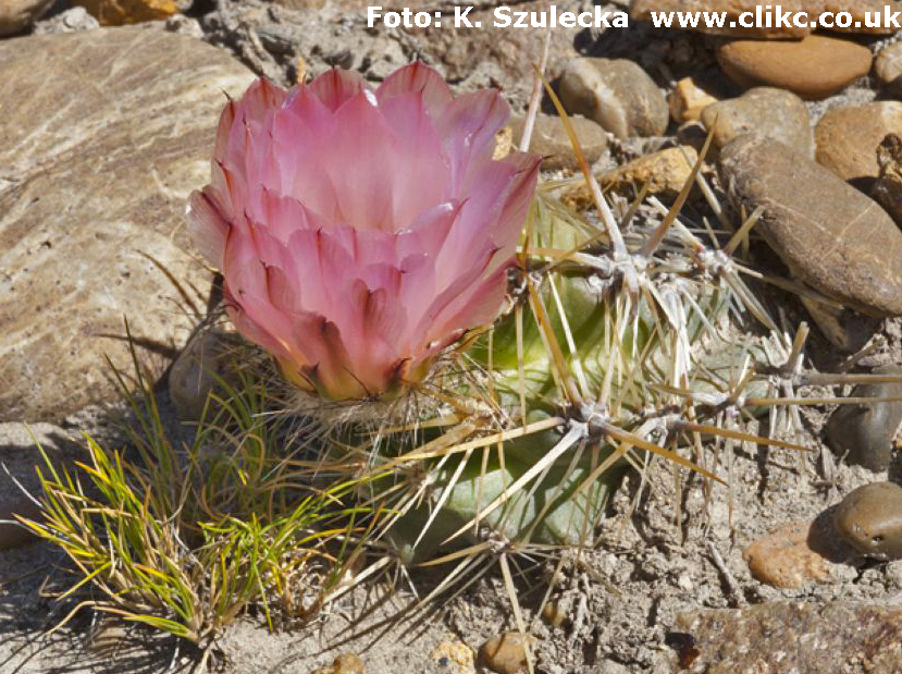 Plantas de (10) 15-40 cm alt. x (1,2) 8-15 cm diám., cilindricas, erectas. Costillas (8) 10-12, prominentes, obtusas. Espinas radiales 8-10 (11), delgadas, de ca. 1 cm; centrales (1) 3-4, más gruesas, de 2-3 cm, uncinadas o arqueadas. Flores de 6 cm x 10 cm diám., subapicales, con el receptáculo corto, muy escamoso. Piezas del perigonio rosadas a amarillentas. Estilo grueso, rojo; estigma ca. 16-lobulado, purpúreo.