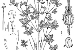 Hierbas bienales, a veces anuales, de 10-67 cm de alto; tallo erecto o postrado, foliado, con tricomas glandulíferos, y a veces también tectores. Hojas basales en roseta, las caulinares opuestas; láminas de contorno poligonal, de (3,5-)4,4-7(-10) × 3,2-10,1 cm, palmatisectas, segmentos (3-)5, el central rómbico, 16-37( -49)-lobados en la mitad distal, base cordada, con tricomas tectores y glandulíferos; estípulas ovadas, de (1,6-)2-4,1(-4,9) × 0,8-2,5 mm, obtusas. Inflorescencia en cima dicasial con ramas monocasiales; címulas 2-fl oras, solitarias; pedúnculos de (13-)27-54(-94) mm de largo, con tricomas tectores y glandulíferos; pedicelos de (3,4-)5,9-12,1(-19,6) mm de largo, con tricomas tectores y glandulíferos. Flores con sépalos lanceolados, de (5-)5,6-6,5(-7,2) mm de largo, con un mucrón de (0,9-)1,2-1,8(-2,6) mm de largo, con tricomas tectores y glandulíferos; pétalos de (8,5-)10,5-12,5(-14,2) × (2,1-)2,6-4,5(-6,1) mm, de ápice redondeado, con uña 2-carinada de 3,1-5,9 mm de largo, purpúreos, glabros; estambres 10, ambos verticilos con anteras purpúreas; nectarios glabros. Fruto tipo “lanzamiento de mericarpo”, de (17,4-)20,2-22,6(-24,4) mm de largo; mericarpos de 2,1-3,2 mm de largo, con un mechón de fibras derivadas del rostro y unidas al apice de cada mericarpo, reticulados, con costillas poco numerosas y delgadas, débilmente anastomosadas en la mitad basal y más abundantes en la distal donde forman en el ápice 1-2(-3) collares que se solapan, de base no estrechada en un pico, sin callo basal ni prolongación triangular, glabros o pilosos; rostro con una zona apical estrechada. Semillas lisas, glabras.