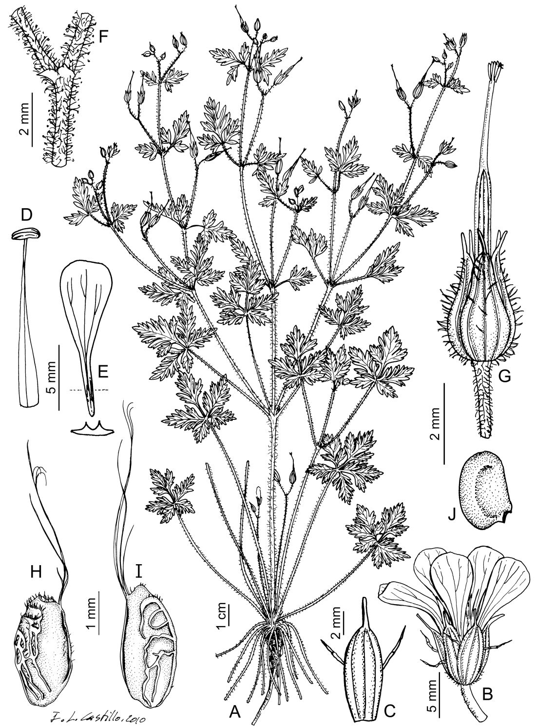 Hierbas bienales, a veces anuales, de 10-67 cm de alto; tallo erecto o postrado, foliado, con tricomas glandulíferos, y a veces también tectores. Hojas basales en roseta, las caulinares opuestas; láminas de contorno poligonal, de (3,5-)4,4-7(-10) × 3,2-10,1 cm, palmatisectas, segmentos (3-)5, el central rómbico, 16-37( -49)-lobados en la mitad distal, base cordada, con tricomas tectores y glandulíferos; estípulas ovadas, de (1,6-)2-4,1(-4,9) × 0,8-2,5 mm, obtusas. Inflorescencia en cima dicasial con ramas monocasiales; címulas 2-fl oras, solitarias; pedúnculos de (13-)27-54(-94) mm de largo, con tricomas tectores y glandulíferos; pedicelos de (3,4-)5,9-12,1(-19,6) mm de largo, con tricomas tectores y glandulíferos. Flores con sépalos lanceolados, de (5-)5,6-6,5(-7,2) mm de largo, con un mucrón de (0,9-)1,2-1,8(-2,6) mm de largo, con tricomas tectores y glandulíferos; pétalos de (8,5-)10,5-12,5(-14,2) × (2,1-)2,6-4,5(-6,1) mm, de ápice redondeado, con uña 2-carinada de 3,1-5,9 mm de largo, purpúreos, glabros; estambres 10, ambos verticilos con anteras purpúreas; nectarios glabros. Fruto tipo “lanzamiento de mericarpo”, de (17,4-)20,2-22,6(-24,4) mm de largo; mericarpos de 2,1-3,2 mm de largo, con un mechón de fibras derivadas del rostro y unidas al apice de cada mericarpo, reticulados, con costillas poco numerosas y delgadas, débilmente anastomosadas en la mitad basal y más abundantes en la distal donde forman en el ápice 1-2(-3) collares que se solapan, de base no estrechada en un pico, sin callo basal ni prolongación triangular, glabros o pilosos; rostro con una zona apical estrechada. Semillas lisas, glabras.
