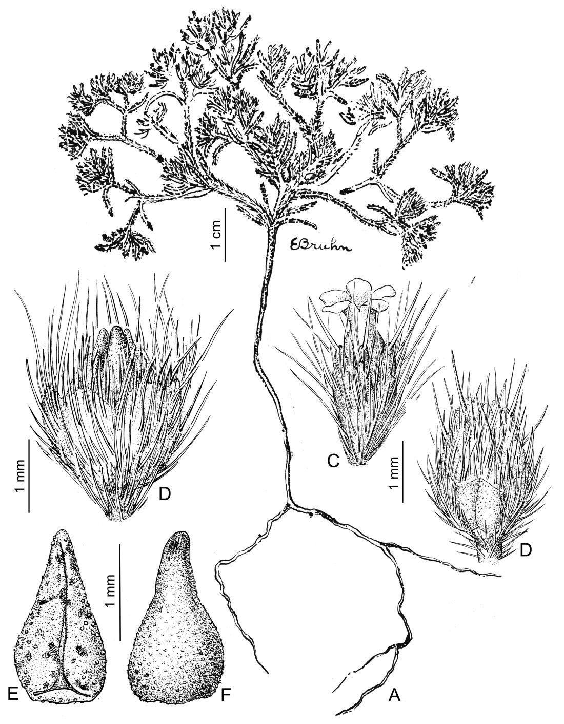 A. Planta. B. Flor. C. Fruto contenido en la porción basal del cáliz. D. Fruto cubierto por el cáliz fructífero. E. Clusa, vista dorsal. F. Clusa, vista ventral.