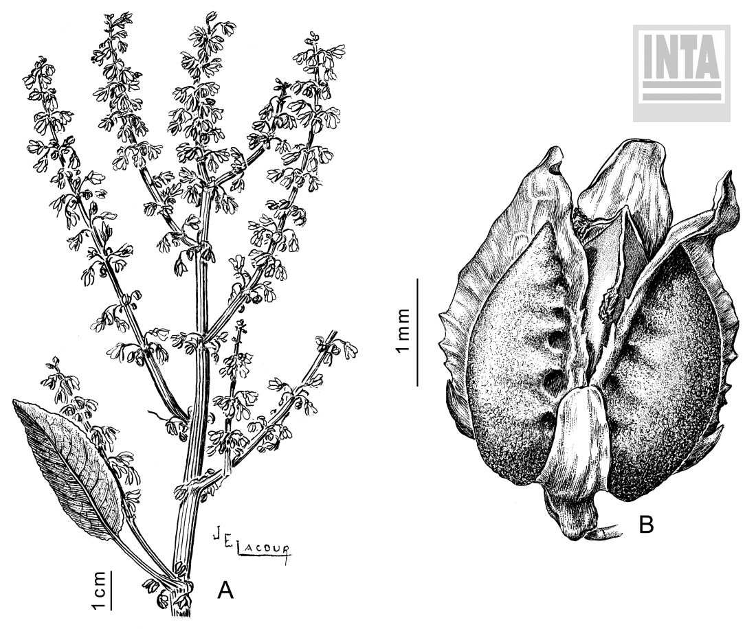 Plantas polígamas, perennes, mayores de 40 cm de alto; tallos ascendentes, sulcados, ± flexuosos, glabros o con escasos pelitos. Hojas pecioladas; pecíolos de 1-5 cm de largo, escabriúsculos; láminas oblongo-elípticas, obovadas o lanceoladas, de 7-17 × 3-6 cm, obtusas en la base, agudas a obtusas en el ápice, con margen levemente crespo, ambas caras glabras, a veces escabriúsculas sobre los nervios, rara vez hipofilo escasamente piloso. Ócreas con borde oblicuo, a veces papilosas. Inflorescencias ± extendidas en la base, densas hacia el ápice, ebracteadas; pedicelos de 0,5-3,5 mm de largo. Perigonio con tépalos externos oblongos, de 1-1,5 mm de largo, obtusos; estambres con filamentos de 0,5-1 mm de largo; anteras de 1,5-2 mm de largo; ovario de 0,5-0,8 mm de largo; estigmas penicilados. Valvas fructíferas ovado-triangulares a oblongas, de 3-4 mm de largo, subagudas a obtusas, irregularmente denticuladas a enteras en la mitad inferior, con callo angostamente ovoide, rugoso. Aquenios elipsoideo-trígonos u ovoideo-trígonos, de 2-2,5 × 1,2-1,3 mm, castaño-oscuros, lisos, brillantes.