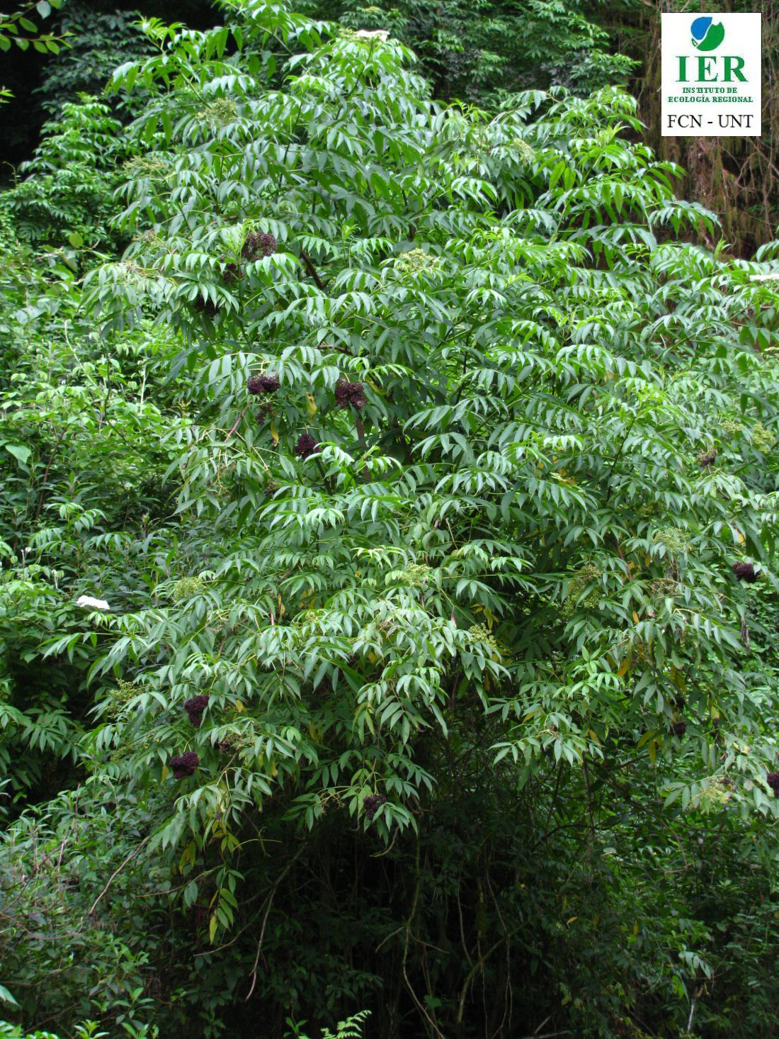 Arbolito o arbusto multicaule hasta de 4-5 m de alto, de copa globosa. Hojas pinnaticompuestas de 12-25 cm de largo, pecíolos de 3-6 cm de largo; folíolos 5-7, opuestos, ovados a elípticoovalados, de 5-11,5 × 2,3-5,7 cm, cortamente peciolulados, redondeados en la base, agudos o acuminados en el ápice, marcadamente aserrados en el margen, glabros y con la cara adaxial lisa, la cara abaxial con nervaduras salientes y pubérula sobre los nervios principales; estípulas lineares presentes a los costados de los pecíolos, a veces tempranamente caedizas u obsoletas. Flores pequeñas, blancas, perfumadas, dispuestas en densas cimas umbeliformes multitloras, ca. 15 cm de diámetro; bractéolas lineares, a veces ausentes; cáliz con dientes ca. 1 mm de largo, agudos, glabros; corola rotácea, de 4,8-5,8 mm de diámetro, partida en 5 lóbulos orbicular-oblongos de 1,5 mm de largo, redondeados; estambres 5, filamentos de 0,5-1,5 mm de largo, y anteras ca. 1 mm de largo, triangulares; ovario 3-4 locular, 3-4 ovulado; estilo corto y grueso estigma lobado. Drupa ovoide a esférica, de 5-6,5(-7) mm de diámetro, jugosa, negra, brillante. Semillas 3-5, ca. 2-2,2 mm de largo, lisas.