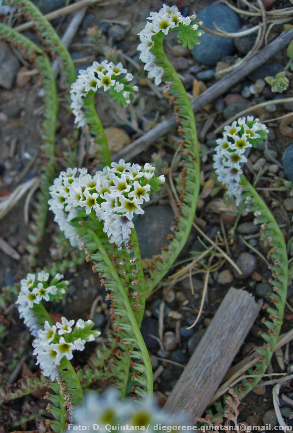 Observaciones: Nombres vulgares y usos. “Cola de gama”, “curucú cáá”, “yerba del sapo”. De acuerdo a Barboza et al. (2006), Heliotropium curassavicum var. curassavicum es empleada en medicina popular como como antitusivo y para contrarrestar dolores hepáticos. Especie con una amplia distribución geográfica en América. En el presente tratamiento se considera a la var. argentinum, descripta por Johnston (1928) para incluir plantas con flores de mayores dimensiones, como un sinónimo de la var. tipo, siendo que no fue posible encontrar una correlación geográfica que sustente la misma. Por lo tanto, en la Argentina, se reconocen 2 variedades, la variedad tipo y la variedad fruticulosum, diferenciadas por el hábito.