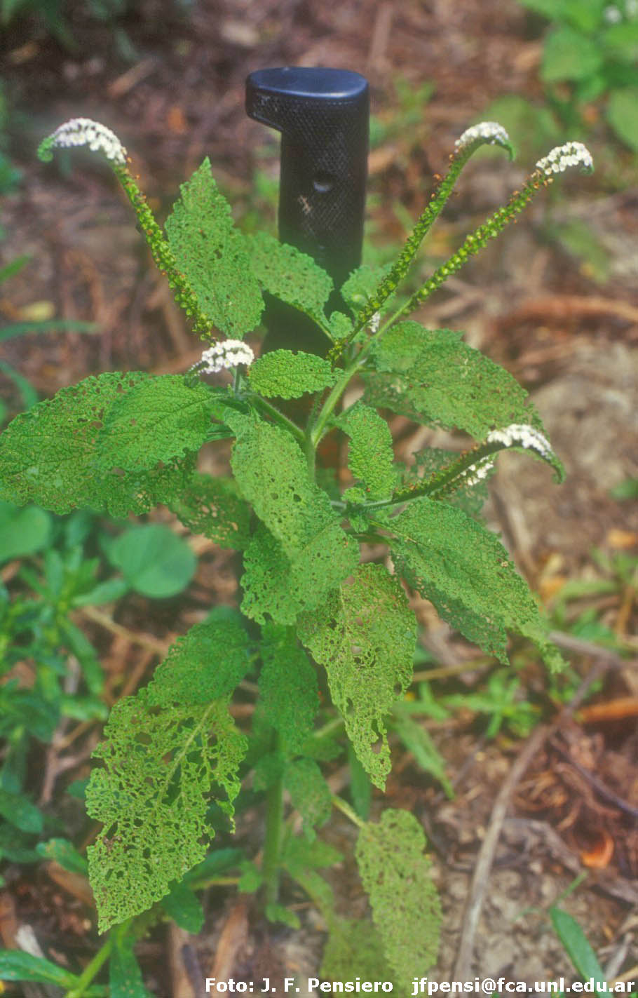 Hierba perenne o subarbusto hasta de 100 cm de alto; tallos erectos, subglabros con algunos pelos híspidos de 2 mm de largo. Hojas alternas; pecíolo de 1-7 cm de largo; láminas elípticas u ovadas, de 3-12 × 2-7 cm, híspidas principalmente sobre las nervaduras, cartáceas, ápice agudo, base obtusa, el margen ligeramente crenulado. Inflorescencias en cincinos hasta de 40 cm de largo, pedunculados, simples, multifloros con 20-30 flores. Flores con cáliz de 3-4 mm de largo, lacinias lineares, densamente híspidas; corola hipocrateriforme, lila o violácea, con el centro amarillo, tubo de 4-10 mm de largo, exteriormente estrigoso, glabro en el interior, lóbulos redondeados; anteras elipsoidales, de 1-1,5 mm de largo; ovario ca. 1 mm de largo, estigma papiloso con reborde basal suave. Fruto marcadamente nervado, de 3-4 × 3-4,5 mm, glabro, dividido en 2 mericarpos divergentes desde la base, independientes a la madurez, generalmente con apículo 2-fido, con área ventral globosa.