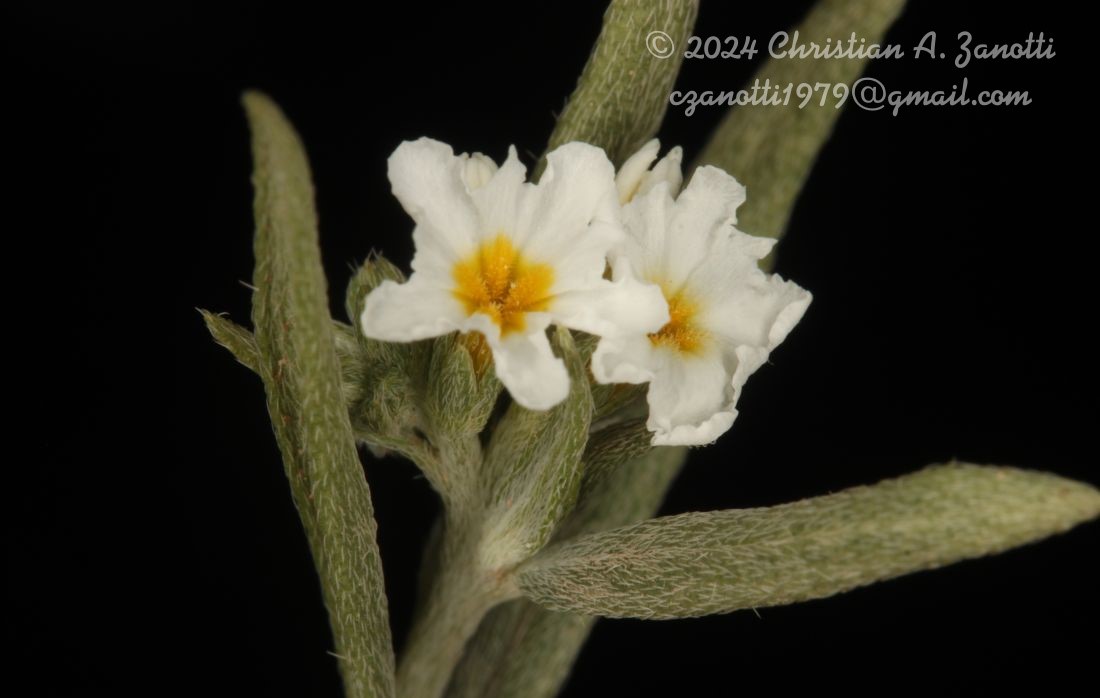 Hierba anual o perenne, hasta de 40 cm de alto, híspida; tallos decumbentes. Hojas alternas; pecíolos de 1-3(-10) mm de largo; láminas lineares, de 10-20(-24) × 1-2(-4) mm, híspidas con pelos de base blanca ancha, cartáceas, ápice obtuso, en ocasiones agudo, base aguda o bien decurrente, el margen liso, revoluto. Inflorescencias en cincinos de 1,5-5(-8) cm de largo, pedunculados, simples o dobles, multifloros con 10-30 flores. Flores con cáliz ca. 2 mm de largo, lacinias ovado-lanceoladas, híspidas, en ocasiones con tricomas glandulares; corola hipocrateriforme, blanca o violácea a la madurez, tubo ca. 3-4 mm de largo, exteriormente piloso, glabro en el interior, limbo de 2-3 mm de diámetro; anteras oblongo-cordiformes, ca. 1 mm de largo; ovario de 0,3-0,4 mm de largo, estigma con columna cilíndrica 4-lobada en el ápice, de 1 mm de largo. Fruto de 1 × 1,5 mm, glabro o apenas piloso, dividido en 4 clusas 1-seminadas, dorso granuloso, en ocasiones con 1 o 2 estrías débiles.