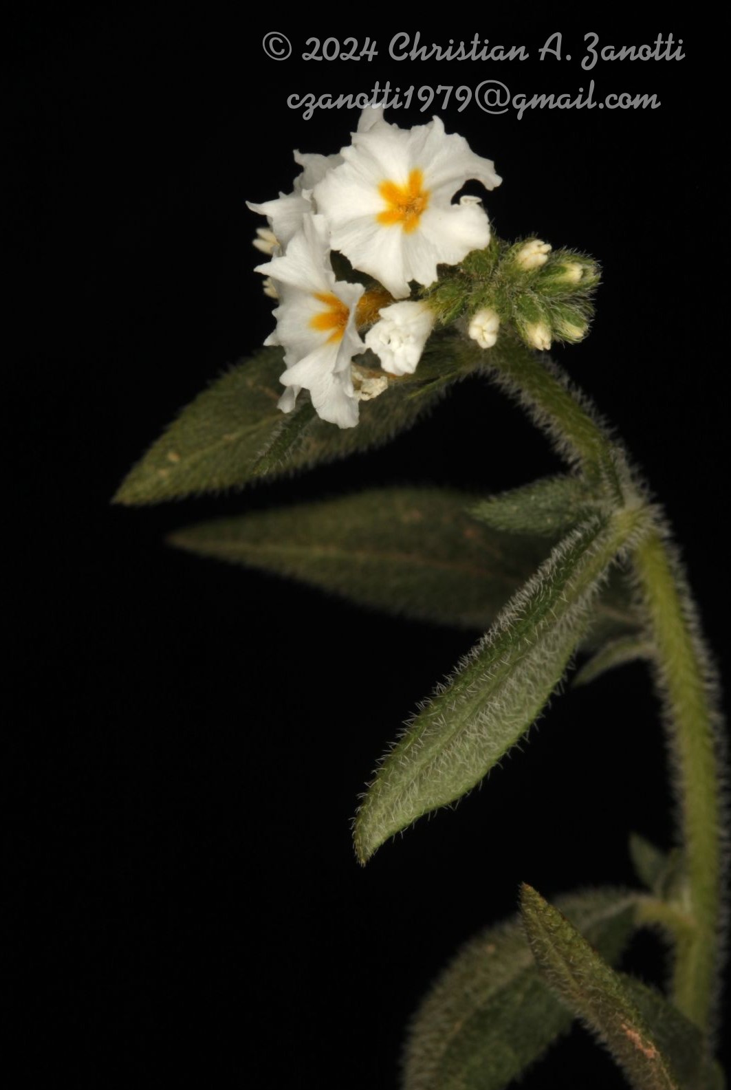 Hierba anual o perenne, hasta de 40 cm de alto, híspida; tallos decumbentes. Hojas alternas; pecíolos de 1-3(-10) mm de largo; láminas lineares, de 10-20(-24) × 1-2(-4) mm, híspidas con pelos de base blanca ancha, cartáceas, ápice obtuso, en ocasiones agudo, base aguda o bien decurrente, el margen liso, revoluto. Inflorescencias en cincinos de 1,5-5(-8) cm de largo, pedunculados, simples o dobles, multifloros con 10-30 flores. Flores con cáliz ca. 2 mm de largo, lacinias ovado-lanceoladas, híspidas, en ocasiones con tricomas glandulares; corola hipocrateriforme, blanca o violácea a la madurez, tubo ca. 3-4 mm de largo, exteriormente piloso, glabro en el interior, limbo de 2-3 mm de diámetro; anteras oblongo-cordiformes, ca. 1 mm de largo; ovario de 0,3-0,4 mm de largo, estigma con columna cilíndrica 4-lobada en el ápice, de 1 mm de largo. Fruto de 1 × 1,5 mm, glabro o apenas piloso, dividido en 4 clusas 1-seminadas, dorso granuloso, en ocasiones con 1 o 2 estrías débiles.