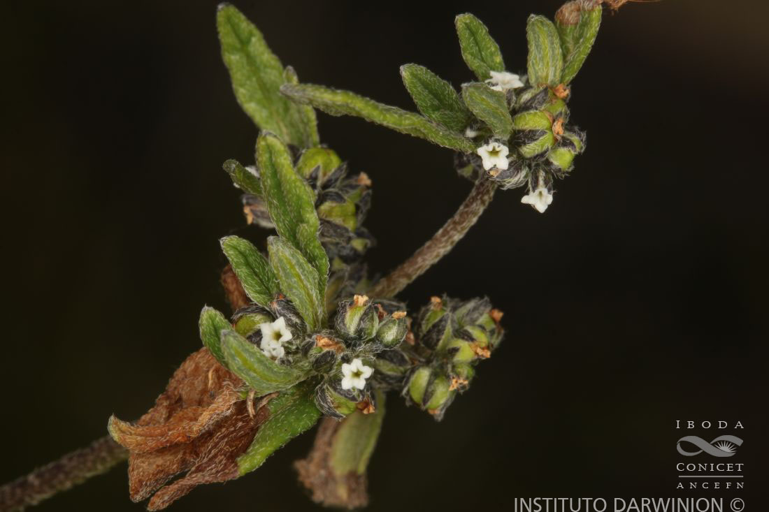 Hierba anual o bianual hasta de 50 cm de alto, estrigosa; ramas procumbentes. Hojas alternas o subopuestas; pecíolos de 2-10 mm de largo; láminas ovado-elípticas, de 0,4-4 × 0,2-1,5 cm, estrigosas, cartáceas, ápice agudo, base aguda, el margen revoluto. Inflorescencias globuloriformes, de 1,5 cm de largo, sésiles, formadas por cincinos breves, paucifloros, con 1-10 flores. Flores con cáliz de 1,5-2 mm de largo, lacinias triangulares, el ápice agudo, híspidas; corola infundibuliforme blanca, tubo de 2 mm de largo, exterior e interiormente glabro, limbo de 1 mm de diámetro, lóbulos redondeados; anteras elipsoidales, de 0,4 mm de largo; ovario ca. 0,75 mm de largo, estigma pubescente con reborde basal suave. Fruto subgloboso, de 2,5-3 ×2,5-3 mm, glabro, dividido a la madurez en 2 mericarpos 2-seminados.