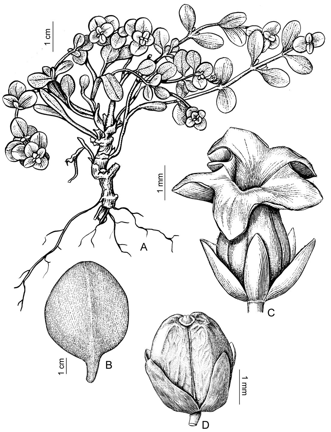 Hierba perenne hasta de 30 cm de alto; tallos postrados, glabros. Hojas opuestas o subopuestas, sésiles a subsésiles; láminas suborbiculares, de 0,7-1(-1,5) × 0,5-0,7(-1) cm, glabras, subcarnosas, ápice redondeado, base aguda o redondeada, el margen liso. Inflorescencias en cincinos hasta de 4 cm de largo, pedunculados, simples o 2-furcados, paucifloros, con 4-15 flores. Flores con cáliz de 2-3 mm de largo, lacinias ovadas, glabras; corola hipocrateriforme, blanca, tubo de 4-6 mm de largo, externa e internamente glabra, limbo de 3 mm de diámetro, lóbulos anchamente triangulares o redondeados; anteras elipsoidales, de 1-1,5 mm de largo; ovario ca. 1,5 mm de largo, estigma cónico. Fruto subgloboso, de 2,5-3 × 2,5-3 mm, glabro, dividido a la madurez en 2 mericarpos 2-seminados.