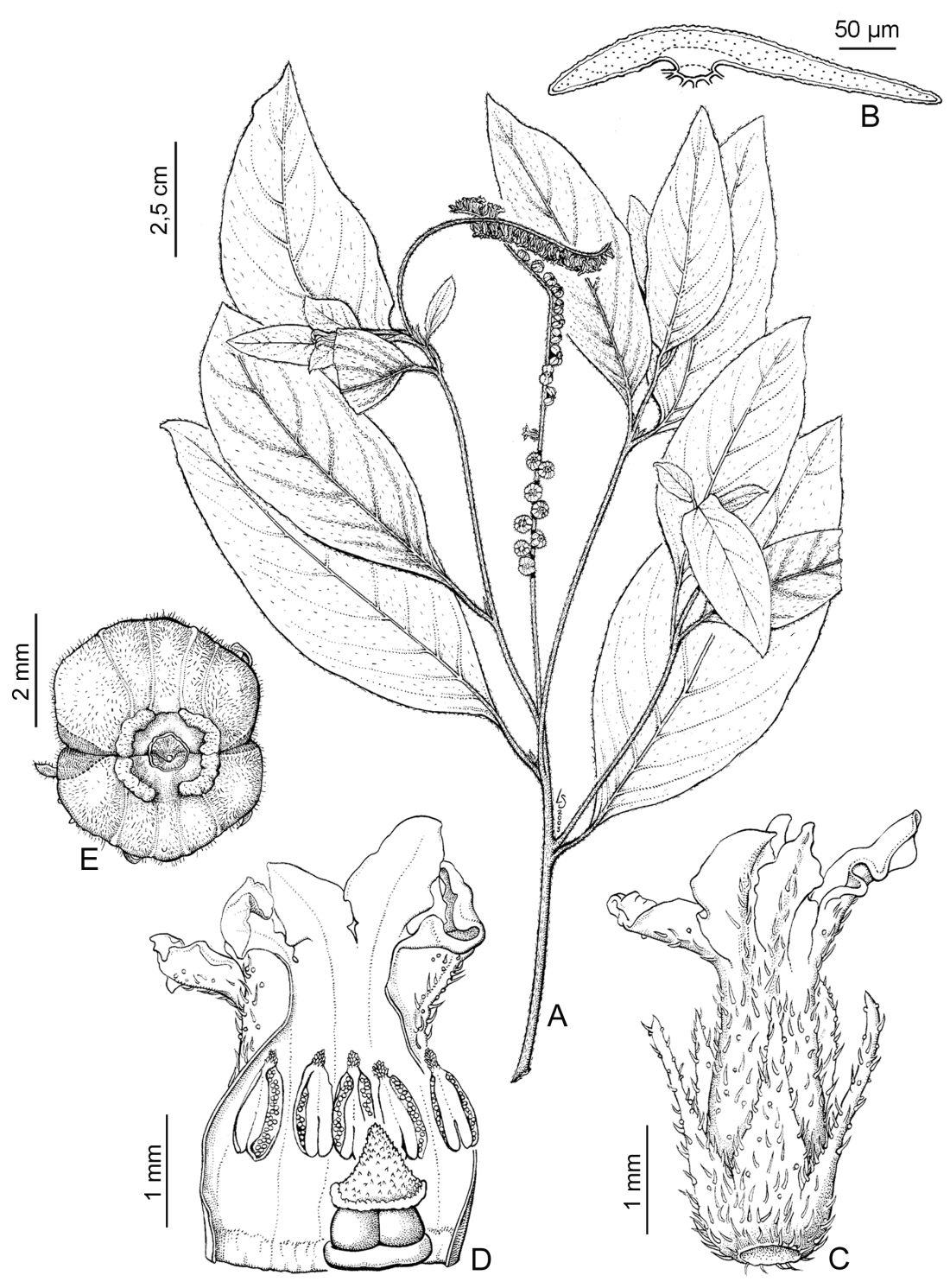 A. Rama con flores y frutos. B. Tricoma malpigiáceo. C. Flor. D. Corola desplegada mostrando androceo y gineceo. E. Fruto.