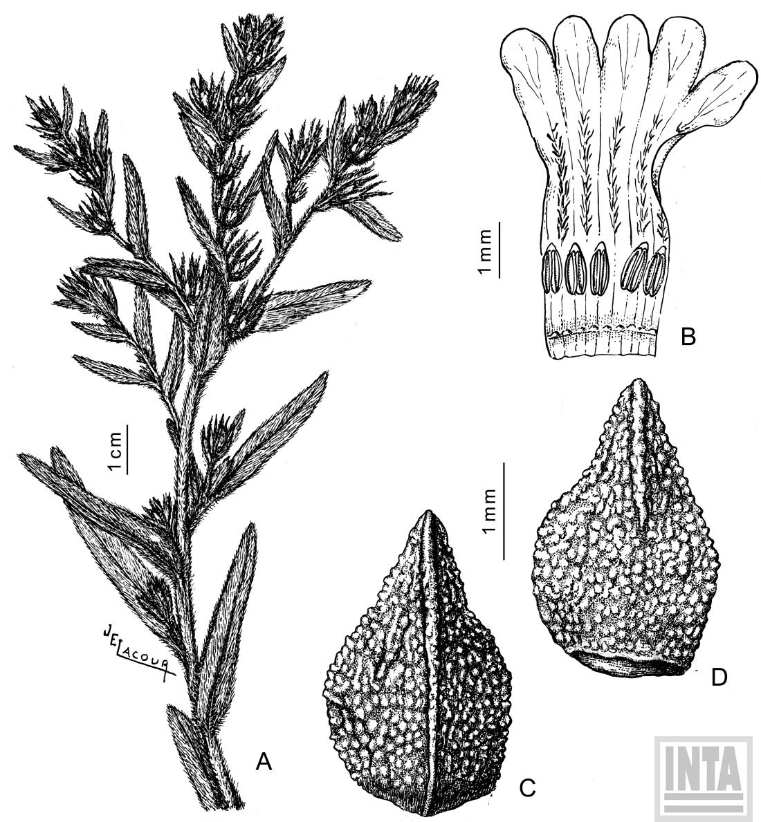 A. Planta. B. Corola desplegada. C. Clusa, vista dorsal. D. Clusa, vista ventral.