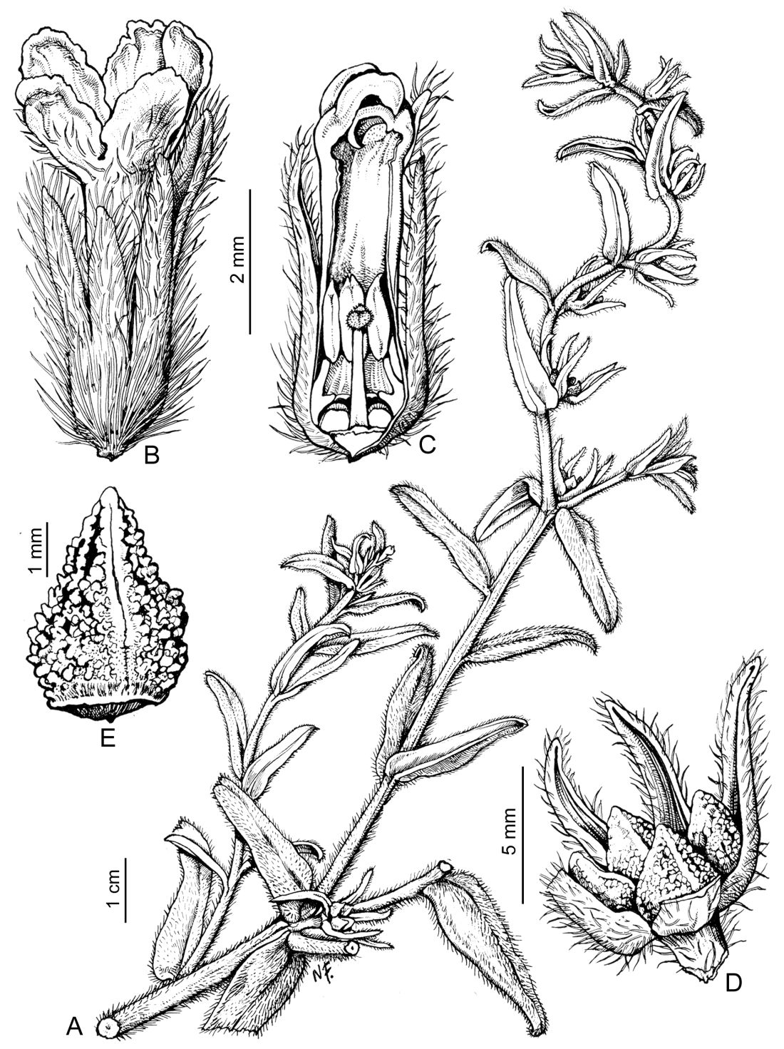 A. Rama florífera. B. Flor. C. Detalle del androceo y el gineceo. D. Clusas del fruto contenidas por el cáliz fructífero. E. Detalle de una clusa.