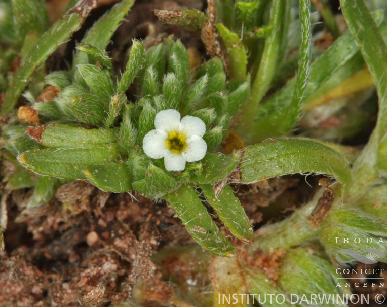 Hierba hasta de 20 cm de alto, rastrera, estrigosa. Hojas opuestas y alternas, sésiles; lámina linear, intrincada, de 10-20(-45) × 1-2 mm, estrigosa, ápice obtuso, base obtusa, margen entero. Inflorescencias en cimas densas en forma de glomérulos, intrincadas entre las hojas, bracteadas. Flores subsésiles; cáliz de 2-2,5 mm de largo, densamente estrigoso, lóbulos 5, oblongo lineares, obtusos; corola tubular, blanca, tubo de 2,5 mm de largo, limbo ca. 2-2,5 mm de diámetro, lóbulos redondeados; anteras insertas en el tubo corolino por encima del estigma. Fruto con 4 clusas, o menos por aborto, inclusas en el cáliz fructífero, exocarpo rugoso, cara dorsal reticulada sin cresta, cara ventral con cresta tenue que termina en la cicatriz suprabasal.