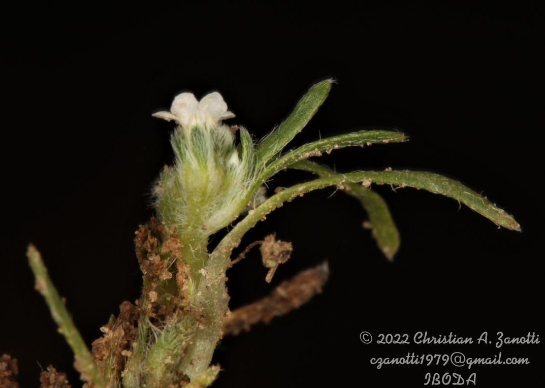 Hierba hasta de 20 cm de alto, rastrera, estrigosa. Hojas opuestas y alternas, sésiles; lámina linear, intrincada, de 10-20(-45) × 1-2 mm, estrigosa, ápice obtuso, base obtusa, margen entero. Inflorescencias en cimas densas en forma de glomérulos, intrincadas entre las hojas, bracteadas. Flores subsésiles; cáliz de 2-2,5 mm de largo, densamente estrigoso, lóbulos 5, oblongo lineares, obtusos; corola tubular, blanca, tubo de 2,5 mm de largo, limbo ca. 2-2,5 mm de diámetro, lóbulos redondeados; anteras insertas en el tubo corolino por encima del estigma. Fruto con 4 clusas, o menos por aborto, inclusas en el cáliz fructífero, exocarpo rugoso, cara dorsal reticulada sin cresta, cara ventral con cresta tenue que termina en la cicatriz suprabasal.