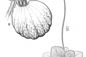 Planta rosulada perenne, pequeña, formando matas densas. Hojas de color verde claro, brillantes, algo carnosas, apoyadas sobre el suelo; láminas ovadas a anchamente ovadas, de 1,5-2,5 × 1,5-2 cm, con punta redondeada poco marcada, atenuada en un corto pecíolo de 8 mm de largo; margen entero a levemente festoneado, notablemente ciliado; nervaduras principales en la cara adaxial prominentes, la central carnosa; ambas caras pilosas, con pelos largos a veces rizados, dispuestos laxamente. Inflorescencia con escapo de unos 15 cm de largo terminado en una cima de dos flores, pedicelos ca. 2 cm de largo, con pilosidad glandular. Sépalos muy pequeños, aovados, agudos de 2,5 × 2 mm, ambas caras con pelos glandulares, breves y laxos en la cara adaxial, largos y densos en la abaxial; corola de color amarillo a crema, con máculas rojo oscuras, líneas horizontales en la garganta, líneas rojas delgadas en el borde de inflexión del apéndice y diseños meandrosos de color rojo intenso en la cara abaxial del labio inferior; labio superior cuculado, de 2,2 × 5,5 mm, comprimido lateralmente sobre las piezas fértiles; labio inferior anchamente ovalado, de 15 × 18 mm, con los bordes laterales levemente curvados hacia arriba en su parte proximal de modo que rodea al labio superior, borde anterior crenado; visto lateralmente es deprimido y de contorno elíptico; garganta muy pequeña, ovalada, de 17-20 mm de largo; apéndice lingüiforme de 10 × 6 mm, plegado en ángulo recto al interior del labio inferior; elaióforo no delimitado, pelos glandulares laxamente dispuestos cubriendo todo el apéndice; filamentos de los estambres de 1 mm de largo, tecas divaricadas orientadas levemente hacia abajo, anteras y estigma expuestos; ovario muy glandular. Cápsula corta y ancha, de 6 × 5 mm laxamente glandular. Semillas no vistas.