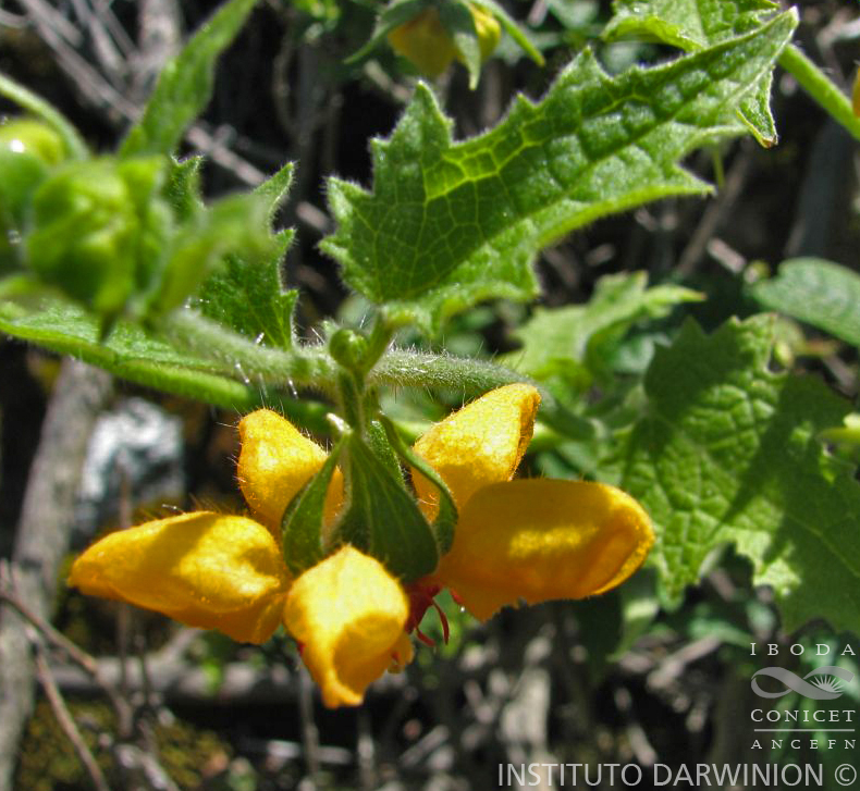 Plantas decumbentes con tallos hasta de 2,50 m de largo, con pubescencia de tricomas urticantes largos de base ensanchada, tricomas escabrosos y gloquidiados. Hojas opuestas, pubescentes; pecíolos de 1,5-12 cm de largo; láminas estrechamente ovadas a ovadas, de 3,5-9 × 1,5-6 cm o palmatilobadas (raras veces pinnatilobadas) de 3-11 × 2-16 cm, ambas con lóbulos agudos e irregularmente dentados, pubescencia más densa en el borde y en la cara abaxial (a veces de apariencia grisácea o canosa al envés). Inflorescencias en dicasios y monocasios terminales, paucifloros que a veces parecen flores solitarias; brácteas foliosas, pediceladas. Flores 5-meras, cáliz con segmentos ovados,de 9-15 × 2-3,5 mm, a veces con ápice agudo o triangulares, frecuentemente reflexos, pubescentes; pétalos cuculados, de 7-15 × 4-7 mm y 3-6 mm de profundidad, anaranjados, cara externa con pubescencia rala; escamas nectaríferas subovadas, de 4-4,5 × 2-3 mm, rojas principalmente, con el ápice blanco, papilosas en el borde y en la mitad inferior dorsal, muy cóncavas, extremo superior con un doble arco en forma de “m” y el borde engrosado y recurvado, cara dorsal con 3 quillas, la central poco desarrollada hasta casi nula y soldada en la parte superior al borde recurvado, en el tercio inferior del dorso con tres apéndices aplanados lateralmente, mayormente rojos, de ± 2 mm de largo, subelípticos o subovados, con una prolongación filiforme de ± 1,5 mm de largo en el borde anterior del tercio superior, el margen subentero o sinuado; estaminodios de 5-6 mm de largo, 2 por escama nectarífera, pilosos en el tercio inferior, subulados, sinuados, con una pequeña bifurcación en la base del tercio superior; estambres 16-20 por fascículo; filamentos de 3,5-7 mm de largo; anteras elipsoideas, de 0,6-1 mm de largo; ovario anchamente obcónico, de 4-5 × 5-6 mm de diámetro en la parte superior, pubescente, plancentas 3, óvulos 9-12, estilo de 2,5-4 mm de largo, piloso en la mitad inferior, 3-fido, a veces con una ligera torsión en el fruto. Frutos cápsulas anchamente obcónicas, de 8-14 × 12-20 mm de diámetro en la parte superior, pubescentes, deflexas en todo su desarrollo, dehiscentes por 3 valvas. Semillas 9-12, generalmente subglobosas, de 3,5-4,5 mm de diámetro, rugosas, a veces indistintamente reticuladas, castañas.