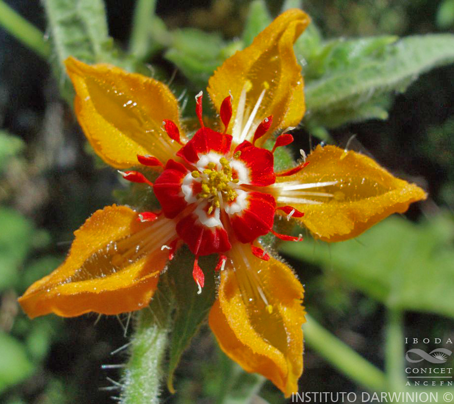 Plantas decumbentes con tallos hasta de 2,50 m de largo, con pubescencia de tricomas urticantes largos de base ensanchada, tricomas escabrosos y gloquidiados. Hojas opuestas, pubescentes; pecíolos de 1,5-12 cm de largo; láminas estrechamente ovadas a ovadas, de 3,5-9 × 1,5-6 cm o palmatilobadas (raras veces pinnatilobadas) de 3-11 × 2-16 cm, ambas con lóbulos agudos e irregularmente dentados, pubescencia más densa en el borde y en la cara abaxial (a veces de apariencia grisácea o canosa al envés). Inflorescencias en dicasios y monocasios terminales, paucifloros que a veces parecen flores solitarias; brácteas foliosas, pediceladas. Flores 5-meras, cáliz con segmentos ovados,de 9-15 × 2-3,5 mm, a veces con ápice agudo o triangulares, frecuentemente reflexos, pubescentes; pétalos cuculados, de 7-15 × 4-7 mm y 3-6 mm de profundidad, anaranjados, cara externa con pubescencia rala; escamas nectaríferas subovadas, de 4-4,5 × 2-3 mm, rojas principalmente, con el ápice blanco, papilosas en el borde y en la mitad inferior dorsal, muy cóncavas, extremo superior con un doble arco en forma de “m” y el borde engrosado y recurvado, cara dorsal con 3 quillas, la central poco desarrollada hasta casi nula y soldada en la parte superior al borde recurvado, en el tercio inferior del dorso con tres apéndices aplanados lateralmente, mayormente rojos, de ± 2 mm de largo, subelípticos o subovados, con una prolongación filiforme de ± 1,5 mm de largo en el borde anterior del tercio superior, el margen subentero o sinuado; estaminodios de 5-6 mm de largo, 2 por escama nectarífera, pilosos en el tercio inferior, subulados, sinuados, con una pequeña bifurcación en la base del tercio superior; estambres 16-20 por fascículo; filamentos de 3,5-7 mm de largo; anteras elipsoideas, de 0,6-1 mm de largo; ovario anchamente obcónico, de 4-5 × 5-6 mm de diámetro en la parte superior, pubescente, plancentas 3, óvulos 9-12, estilo de 2,5-4 mm de largo, piloso en la mitad inferior, 3-fido, a veces con una ligera torsión en el fruto. Frutos cápsulas anchamente obcónicas, de 8-14 × 12-20 mm de diámetro en la parte superior, pubescentes, deflexas en todo su desarrollo, dehiscentes por 3 valvas. Semillas 9-12, generalmente subglobosas, de 3,5-4,5 mm de diámetro, rugosas, a veces indistintamente reticuladas, castañas.