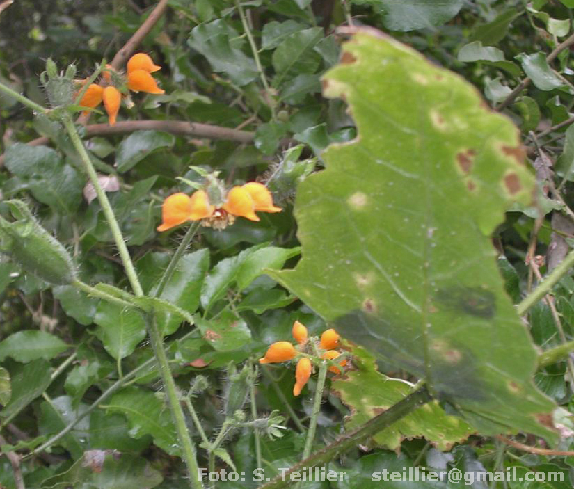 Plantas bienales, llegando a más de 0,7 m de alto, muy urticantes, pubescentes; con pubescencia de tricomas urticantes largos de base ensanchada, tricomas escabrosos y gloquidiados; tallos muy ramificados desde la base en el segundo año, erguidos, pubescentes. Hojas opuestas, pubescentes; las inferiores con pecíolos hasta de 8 cm de largo, las superiores sésiles o subsésiles; láminas ovadas, hasta de 30 × 17 cm, pinnatilobadas, segmentos y lobos generalmente dentados, cara adaxial con pubescencia más rala. Inflorescencias generalmente en dicasios paucifloros terminales; brácteas foliáceas. Flores 5-meras, subhorizontales a deflexas, pedicelos hasta ca. 2 cm de largo; cáliz con los segmentos subovados, de 8-10 × 3-4 mm, patentes, tanto en botones maduros como en flores antéticas, con ápice agudo, tricomas largos distribuidos en el borde y en la cara externa; pétalos cuculados, de 15-20 × 4-6 mm y 6-7 mm de profundidad, emarginados, anaranjados, pubescentes externamente con algunos tricomas largos, especialmente en la línea media de la cara externa, internamente glabrescentes, ápice generalmente 2-fido; escamas nectaríferas subrectangulares, de 3-5 × 2-3 mm, completamente rojas o anaranjadas en la base y rojas hacia el ápice, papilosas y algo pubescentes, muy cóncavas, gradualmente ensanchadas en la mitad superior, sacciformes en la mitad inferior, el borde superior engrosado ligeramente con un doble arco en forma de “m” en el ápice, cara dorsal con 3 quillas longitudinales, base de las quillas con sendos apéndices de 3-5 mm de largo, insertos en el tercio medio o inferior de la escama, subfiliformes a estrechamente espatulados, rojos o anaranjados y con una pequeña prolongación filiforme en el extremo superior, blanca, amarilla o anaranjada; estaminodios algo sinuados, ca. 10 mm de largo, 2 por escama nectarífera, pilosos en el dorso, especialmente en la mitad inferior, parte superior ventral con una prolongación subulada, muy reducida, papilosa, parte superior dorsal con un pequeño engrosamiento; estambres 15-18 por fascículo; filamentos de 7-10 mm de largo; anteras elipsoideas, de 1-2 mm de largo; ovario obcónico, de 7-8 mm de largo × 4-5 mm de diámetro en la parte superior, con fina pubescencia, placentas 3, óvulos numerosos; estilo ca. 4 mm de largo, piloso en los dos tercios inferiores, 3-fido. Frutos cápsulas obcónicas, de 18-22 mm de largo × 7-8 mm de diámetro en la parte superior, pubescentes, deflexas cuando inmaduras, horizontales a erguidas cuando maduras, dehiscentes por 3 valvas. Semillas 20-25, de formas variadas, de 3-4 mm de largo, crestadas y con reticulado poco conspicuo subrectangular, castaño oscuras.