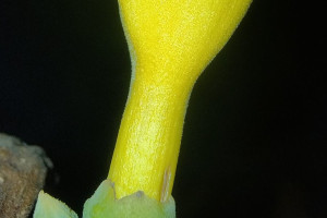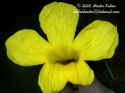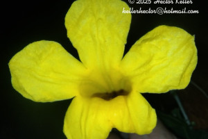 Liana de 5-35 m de alto, tallos estriados, lenticelados, de 3,5 cm de diám., nudos sin campos glandulares, con línea interpeciolar; profilos de las yemas axilares ovados, con nectarios en el envés. Hojas 2-3-folioladas, pecíolo glabro, de 1,5-2,5 cm de largo; peciólulos glabros, de 1,5-4 cm de largo; folíolos ovados, acuminados, de 3,5-14 × 1,5-10 cm, coriáceos, glabros, con margen cartilaginoso blanquecino en seco, venación pinnada, haz lustrosa, envés sin domacios, con pelos glandulares peltados y nectarios hundidos de borde prominente, laxamente dispersos. Zarcillos simples. Racimos apicales o axilares, de 10-15 cm de largo; raquis anguloso; brácteas caducas, elípticas o angustiovadas, ápice agudo, de 5-10 × 1-3 mm, subtomentosas, con nectarios dispersos; bractéolas linearelípticas, de 1,5-3 × 0,6-1 mm. Cáliz tubuloso, de 7-11 × 5-8 mm, 5-denticulado, subtomentoso, con nectarios negruzcos, ligeramente hundidos, de reborde prominente; corola cilíndrica en la porción basal (1,2-2 cm) luego ensanchada, campanulada, de 5-8,5 × 3-5 cm, amarilla, pilosa por fuera; estambres inclusos, anteras con tecas subopuestas, de 3,5 mm de largo, conectivo apiculado; ovario subcilíndrico, glabro, de 3 mm de largo. Cápsulas de 20-33 × 2-3 x 1-2 cm, a veces curvadas, valvas lignificadas, oscuras, sin rebordes, vena media no saliente. Semillas de contorno oblongo, de 14-20 × 50-60 mm, cuerpo opaco, grueso, alas membranáceas.