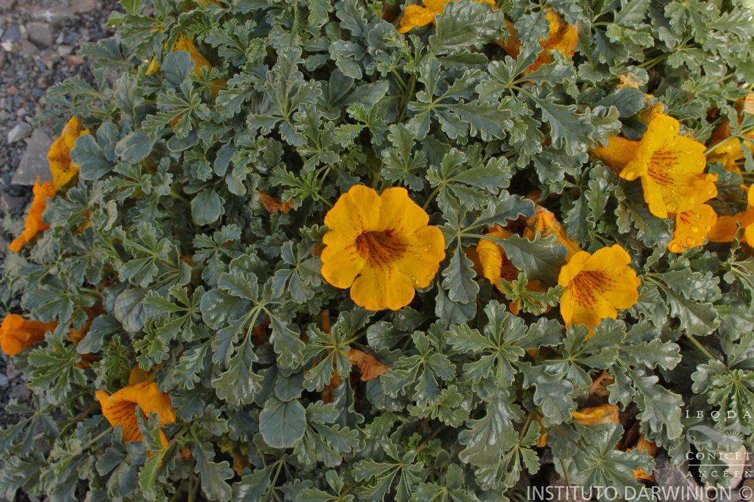 Hemicriptófita decumbente, de 5-15 cm de alto, glanduloso- pubescente, tallos ramosos, hojosos, raíces gruesas, leñoso- carnosas, con ramificaciones extensas, rizomatiformes, hasta de 40 × 0,5-3 cm. Hojas 3-7-folioladas; pecíolo cilíndrico de 0,5-6 cm de largo; folíolos sésiles, obovados o angustiobovados, de 5-23 × 2-19 mm, siendo el mediano frecuentemente el mayor, margen crenado o lobado-crenado, revoluto. Racimos paucifloros, escapo de 2-3 cm de largo, brácteas subuladas, de 2-3 mm de largo. Flores fragantes; pedicelos de 4-6 mm de largo; corola campanulada de base tubulosa, de 4-5 cm de largo, amarilla o amarillo-anaranjada, con máculas rojas en la garganta, por fuera con pelos glandulares y pelos simples pluricelulares crespos, lóbulos con cara adaxial papilosa; estambres con pelos glandulares en la base, anteras con tecas ovadas, opuestas, de 1,5-2 mm largo, con 2-5 tricomas subapicales; ovario cilíndrico, ca. 2 × 1 mm. Cápsulas silicuiformes, de 4,5-10 × 0,4-0,6 cm, frecuentemente curvadas, superficie rugosa con tricomas glandulares diminutos esparcidos. Semillas de contorno trapezoidal, de 2,5 × 4,5-5 × 1-1,5 mm, gruesas, coriáceas.