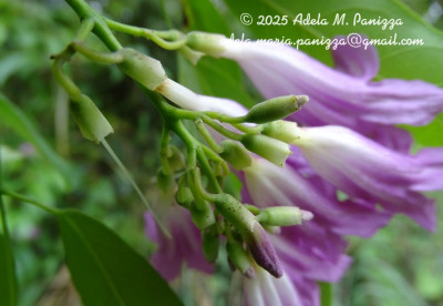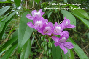 Liana de 3-30 m de alto, ramas estriadas, con lenticelas redondeadas o elípticas, de 0,4-1,1 mm de largo, nudos con campos glandulares, línea interpeciolar inconspicua o ausente; profilos de las yemas axilares ovados, de 1 mm de largo. Hojas 2-3-folioladas, pecíolos hemicilíndricos, de 1,7-4,3 cm de largo, peciólulos canaliculados, de 3-10 mm de largo, ambos glabros o la haz pubérula; folíolos coriáceos, angustiovados u oblongos, a veces ovados o elípticos, de 4-10 × 2-4,8 cm, rojizos en seco, a veces color café, ápice apiculado o agudo, a veces obtuso, frecuentemente mucronulado, margen entero, haz lustrosa, envés glabro sin domacios o axilas barbadas, nectarios escasos, venación menor más prominente en el envés. Zarcillos simples. Tirso piramidal, terminal o axilar, de 13-30 cm de largo, brácteas deciduas, sésiles, ovadas, agudas, de 1-1,5 mm de largo, pedicelos de 3-7 mm de largo, bractéolas sésiles, ovadas, agudas, de 0,8-1 mm de largo. Cáliz tubuloso, de 4-6 × 3-4,5 mm, tomentoso, pelos simples de 0,5 mm de largo, con nectarios circulares hacia el borde denticulado; corola infundibuliforme, blanco-lilácea a rosado-purpúrea, pilosa por fuera, garganta blanca, de (1,4-)2,5-3,8 × 1,3-2,5 cm, lóbulos densamente pilosos, de 5-6 mm de diám.; anteras de tecas opuestas, conectivo engrosado; disco de 0,5 mm de largo; ovario cilíndrico, de 2,5 mm de laro. Cápsulas lineares, agudas, de 9-29 × 0,7-1,3 cm, coriáceas, pardo-oscuras, a veces con rebordes salientes, superficie granulosa, vena media filiforme, a veces ligeramente elevada. Semillas de contorno elíptico, de 5-8 × 16-31 mm, cuerpo pardo, alas hialinas.