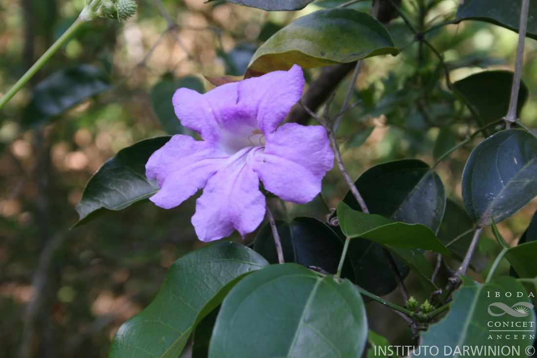 Liana de 7-25 m de alto, tallos con lenticelas elípticas de 1-5 × 0,6-1 mm, ramas jóvenes cilíndricas, estriadas, glabras, nudos con o sin pliegue interpeciolar, sin glándulas; profilos de las yemas axilares de 1,5-2,5 mm de largo. Hojas 1-2-folioladas; pecíolo de 1,5-4 cm de largo y peciólulos de 0,8-2 cm de largo, con la haz acanalada, glabros; folíolos oblongos o elípticos, de 8,5-12,5(-16) × 3,3-6,5(-7,5) cm, ápice acuminado o agudo, margen entero, haz glabra, envés laxamente escamoso, a veces con campos glandulares en la base. Inflorescencia en racimos decusados 4-8- floros; pedúnculos de 0,2-5 cm de largo, raquis de 0,6-7 cm de largo; brácteas caducas, subuladas, de 3,5-5 mm de largo. Flores perfumadas; pedicelo de 2,5-4,7 cm de largo, glabro; bractéolas caducas, subuladas, de 1,5-3 mm de largo, alternas o subopuestas, insertas en la parte apical; cáliz campanulado, irregularmente lobado o rasgado, de 6-9 × 7-10 mm, cara externa con pelos glandulares esparcidos, a veces con nectarios presentes, margen glabro o con micropelos de 0,2 mm de largo, lóbulos terminados en dientes incurvos de base ancha, de 1-3 mm de largo; corola tubuloso- campanulada, de 6,5-12 cm de largo, lilácea, por fuera con pelos glandulares y pelos simples articulados, garganta blanco-cremosa con estrías violáceo-purpúreas, lóbulos redondeados, de 2-3,5 cm de largo; estambres inclusos, tecas elípticas, divergentes; ovario elipsoide, de 3,5 mm de largo, granuloso. Cápsulas elipsoides, de 10-13 × 3,5 cm, cara externa con púas uncinadas de 5-8 × 3-4 mm. Semillas de contorno elíptico, de 2 × 5 cm, cuerpo grueso, opaco, ala unilateral de bordes hialinos.
