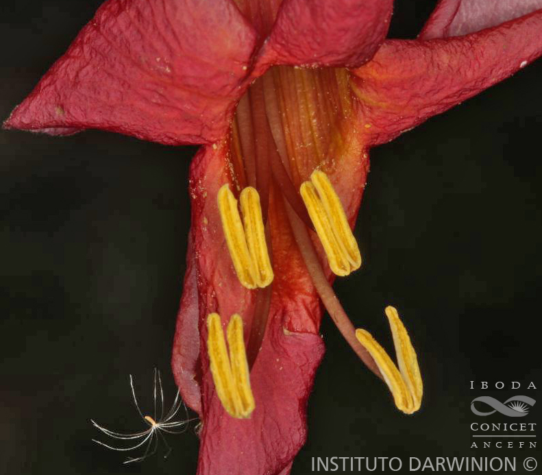 Liana de 3-10 m de alto, tallo hasta de 20 cm de diám., corteza agrietada, rugosa; ramas con lenticelas elípticas, de 0,5-0,6 mm de largo, nudos con campos glandulares, línea interpeciolar a veces presente; profilos de las yemas axilares angustiovados, de 2 mm de largo. Hojas bifolioladas o con zarcillo terminal trigarfiado, pecíolo de 1,2-2,4 cm de largo, estriado, glabro; peciólulos de 2-3 mm de largo, estriados, glabros; folíolos coriáceos, ovados o angustiovados a elípticos, de 3,1-8 × 1,3-4,2 cm, glabros, borde entero, ápice mucronado, haz lustrosa, venación menor visible en ambas caras, envés con escamas dispersas, nectarios escasos o ausentes. Inflorescencias en cimas axilares o terminales dicotómicas 2-8-floras, a veces flores solitarias; brácteas moradas o vinosas, de 1,7-2,1 × 1 cm, elípticas, mucronadas, caducas. Flores perfumadas, pedicelos de 4-32 mm de largo, bractéolas coloreadas, sésiles, ovadas o latielípticas, mucronadas, de 5-20 × 4-16 mm; cáliz purpúreo-vinoso, inflado, espatiforme, persistente, de 2,6-2,7 × 1,3-1,9 cm, glabro, cortamente apiculado; corola tubulosa, anaranjada a rojo- oscura, de 4,5-7 cm de largo, glabra, lóbulos amarillos, anaranjados o rojizos, de 1,5 cm de diám.; estambres con anteras exertas, conectivo obtuso, tecas paralelas o algo divergentes, de 4,3-5,4 mm de largo; ovario oblongo, de 3-5 mm de largo, disco pulvinado. Cápsulas loculicidas, fusiformes, de 6-13 × 1,5-2,4 cm, coriáceas, negruzcas, ligeramente rugosas, tabique perpendicular a las valvas. Semillas de contorno elíptico, de 1-1,5 × 2-2,8 cm, delgadas, bialadas, cuerpo opaco cordiforme, alas hialinas.