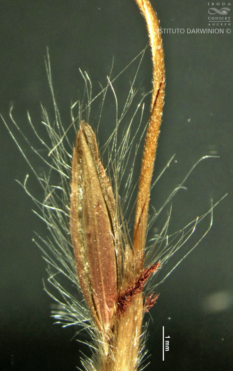 Plantas perennes, cespitosas, con cañas de 15-55 cm de alto, erectas, delgadas, simples o ramificadas en los nudos superiores; nudos barbados; vainas usualmente más largas que los entrenudos, esparcidamente pilosas a densamente vilosas; lígulas membranáceas, de 2 mm de largo, de ápice cortamente piloso; láminas lineares, de 10-25 x 0,2-0,4 cm, predominantemente basales, las superiores reducidas en tamaño, esparcidamente pilosas a vilosas, con los márgenes revolutos. Inflorescencia terminal, formadas por 3-7 racimos espiciformes, digitados, vilosos, subnutantes; pedúnculo exerto, cilíndrico, pubescente en la porción superior, el resto glabro; ramificaciones de primer orden de 2-5 cm de largo (sin las aristas), desnudas en la base, pilosas; raquis de las ramificaciones piloso, tenaz en la porción basal del raquis y frágil hacia la porción apical. Espiguillas superiores sésiles, pistiladas, de 5-7,5 mm de largo, en ocasiones con estaminodios; gluma inferior tan larga como la espiguilla, pilosa, con pelos patentes de base tuberculada, el dorso longitudinalmente surcado, plurinervia; gluma superior tan larga como la espiguilla, glabra, pálida, de ápice agudo, con un surco longitudinal por donde pasa la arista de la lemma superior; lemma superior transformada en una arista robusta, de 3-4 cm de largo, retorcida en la porción basal, geniculada, púberula, escabrosa, sin expansiones basales; palea superior oblonga, de 3-4 mm de largo, hialina, mútica; estigmas 2, estilos plumosos, rojo-oscuros, de emergencia apical o subapical; espiguillas superiores pediceladas similares a las espiguillas sésiles, sin arista de 6-9 mm de largo; pedicelos de 3-4 mm de largo, pilosos; gluma inferior tan larga como la espiguilla, rígida; pilosa, con pelos patentes; gluma superior oblonga, papirácea, glabra; lemma superior de 3-5 de largo, hialina, mútica; pálea superior similar a la lemma; gineceo rudimentario; estambres 3, anteras de 4-5 mm de largo, amarillas; espiguillas basales pediceladas o sésiles similares a las espiguillas pediceladas superiores; cariopsis fusiforme, de 2,6-3 mm de largo, castaño; con restos de base estilar en el ápice.