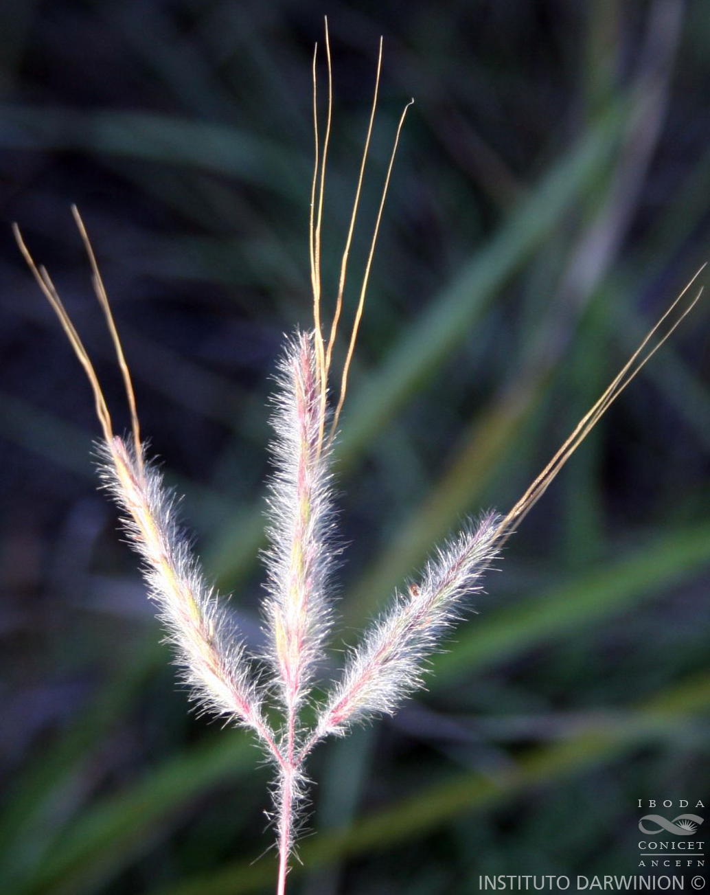 Plantas perennes, cespitosas, con cañas de 15-55 cm de alto, erectas, delgadas, simples o ramificadas en los nudos superiores; nudos barbados; vainas usualmente más largas que los entrenudos, esparcidamente pilosas a densamente vilosas; lígulas membranáceas, de 2 mm de largo, de ápice cortamente piloso; láminas lineares, de 10-25 x 0,2-0,4 cm, predominantemente basales, las superiores reducidas en tamaño, esparcidamente pilosas a vilosas, con los márgenes revolutos. Inflorescencia terminal, formadas por 3-7 racimos espiciformes, digitados, vilosos, subnutantes; pedúnculo exerto, cilíndrico, pubescente en la porción superior, el resto glabro; ramificaciones de primer orden de 2-5 cm de largo (sin las aristas), desnudas en la base, pilosas; raquis de las ramificaciones piloso, tenaz en la porción basal del raquis y frágil hacia la porción apical. Espiguillas superiores sésiles, pistiladas, de 5-7,5 mm de largo, en ocasiones con estaminodios; gluma inferior tan larga como la espiguilla, pilosa, con pelos patentes de base tuberculada, el dorso longitudinalmente surcado, plurinervia; gluma superior tan larga como la espiguilla, glabra, pálida, de ápice agudo, con un surco longitudinal por donde pasa la arista de la lemma superior; lemma superior transformada en una arista robusta, de 3-4 cm de largo, retorcida en la porción basal, geniculada, púberula, escabrosa, sin expansiones basales; palea superior oblonga, de 3-4 mm de largo, hialina, mútica; estigmas 2, estilos plumosos, rojo-oscuros, de emergencia apical o subapical; espiguillas superiores pediceladas similares a las espiguillas sésiles, sin arista de 6-9 mm de largo; pedicelos de 3-4 mm de largo, pilosos; gluma inferior tan larga como la espiguilla, rígida; pilosa, con pelos patentes; gluma superior oblonga, papirácea, glabra; lemma superior de 3-5 de largo, hialina, mútica; pálea superior similar a la lemma; gineceo rudimentario; estambres 3, anteras de 4-5 mm de largo, amarillas; espiguillas basales pediceladas o sésiles similares a las espiguillas pediceladas superiores; cariopsis fusiforme, de 2,6-3 mm de largo, castaño; con restos de base estilar en el ápice.