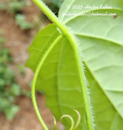 Liana de 4-6 m de alto, ramas estriadas con lenticelas circulares o elípticas de 0,3-0,4 mm de largo, ramas jóvenes pubérulas, nudos con campos glandulares y línea interpeciolar; profilos de las yemas axilares angustiovados, acuminados, de 1,8-3 × 0,4-0,8 mm. Hojas bifolioladas o con zarcillo terminal trigarfiado, pecíolo de 1-2,7 cm de largo, peciólulos de 6-30 mm de largo, ambos con micropelos y pelos simples de 0,4-0,6 mm de largo; folíolos ovados, de 4-8,3(-9) × 1,7-5,5 cm, cartáceos, irregularmente dentados, ápice agudo o acuminado, haz glabra, envés con pelos glandulares sésiles dispersos, algunos nectarios en la mitad basal, venas principales pilosas, venación menor visible sólo en el envés. Flores axilares solitarias, pedicelos de 3,5-4,5 cm de largo, bractéolas sésiles, elípticas, apiculadas, de 5- 18 × 1-5 mm; cáliz algo inflado, espatiforme, de 1,5-3 cm de largo, con un diente dorsal, salpicado con escamas y tricomas glandulares diminutos estipitados; corola tubulosa, amarillo vivo o pálido, de 5-7,5 × 2,5-4 cm, con tricomas glandulares diminutos esparcidos, lóbulos amarillos, de 1,3-1,8 cm de diám.; estambres inclusos, conectivo obtuso, tecas divergentes; disco de 1,5-2 mm de largo, ovario cilíndrico, de 5-6 mm de largo. Cápsulas septicidas, lineares u oblongo-lineares, negruzcas, de 15-33 × 1,5-2 cm. Semillas elípsoides, gruesas, de 10-11 × 15-18 × 2-3 mm, pardo-oscuras, alas angostas, de 1-2 mm de largo, bordes membranáceos, hialinos.